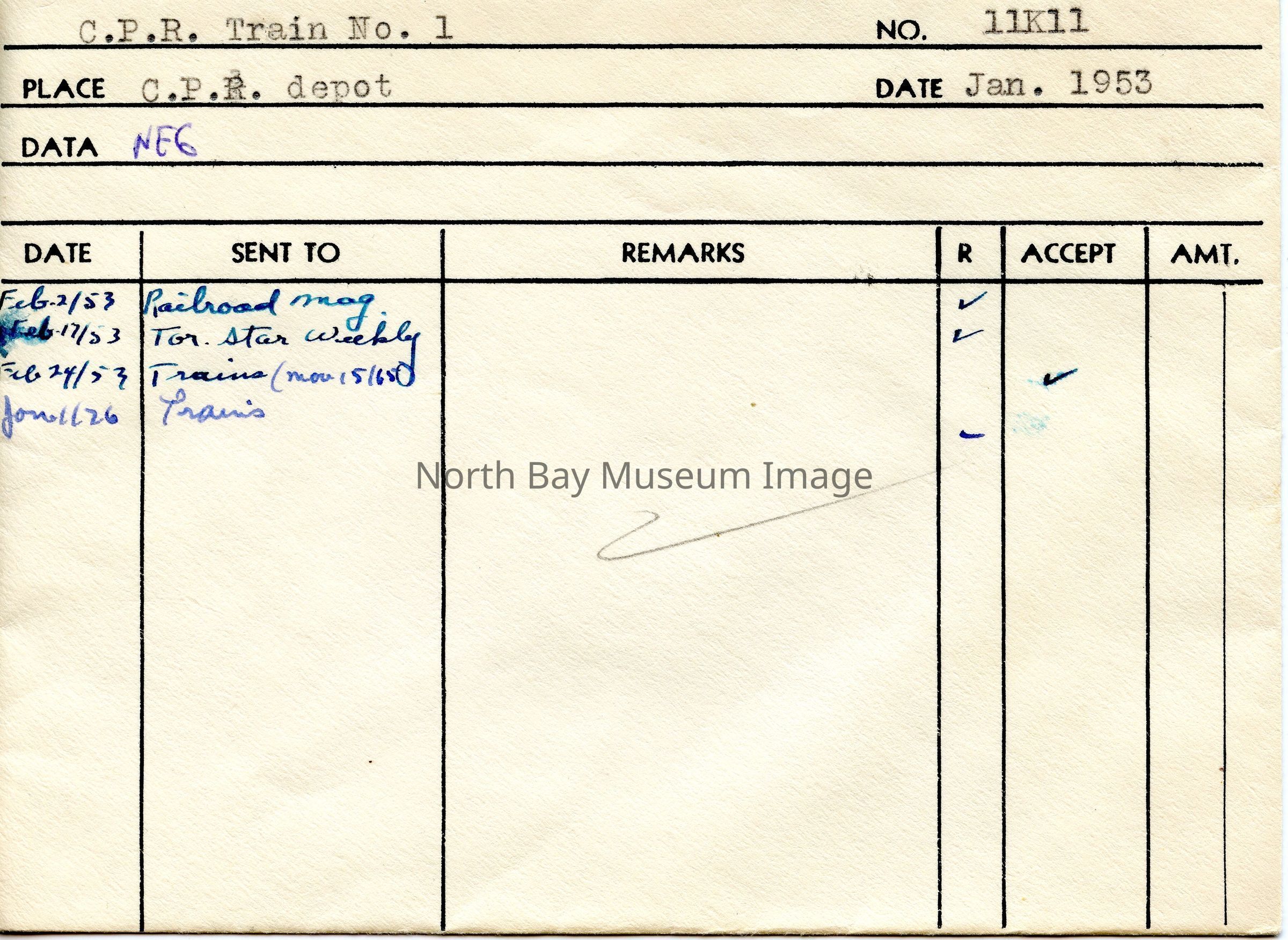 (a) is a Envelope that held photos of C.P.R. Train No. 1." These photos were taken at the C.P.R. depot in Jan. 1953. The publications are listed on the envelope. (b) is the negative of the CPR train. The photo is of the CPR Steam Engine # 2472. This train is headed Westbound and can be seen in the distance.Creator