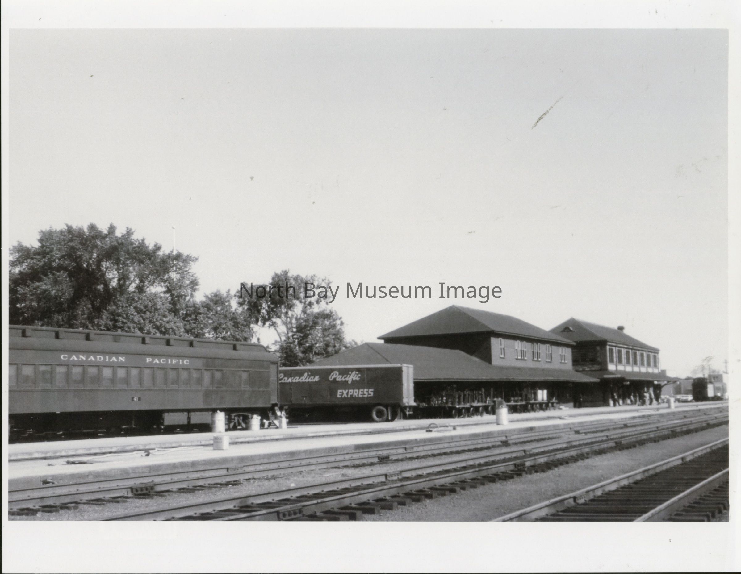 A photograph of the train station looking from the tracks and yards. A CP transport truck hangs along the platform.