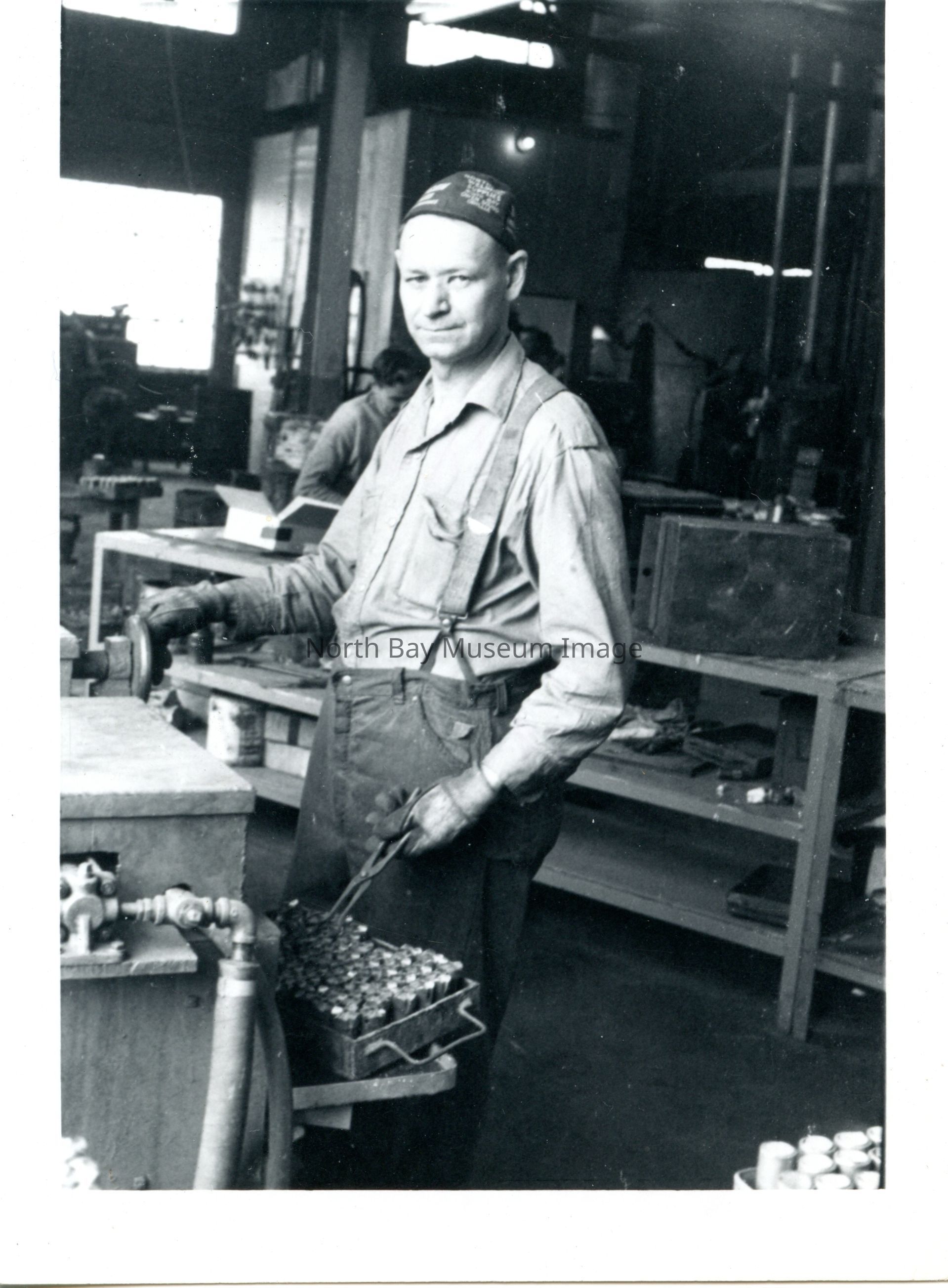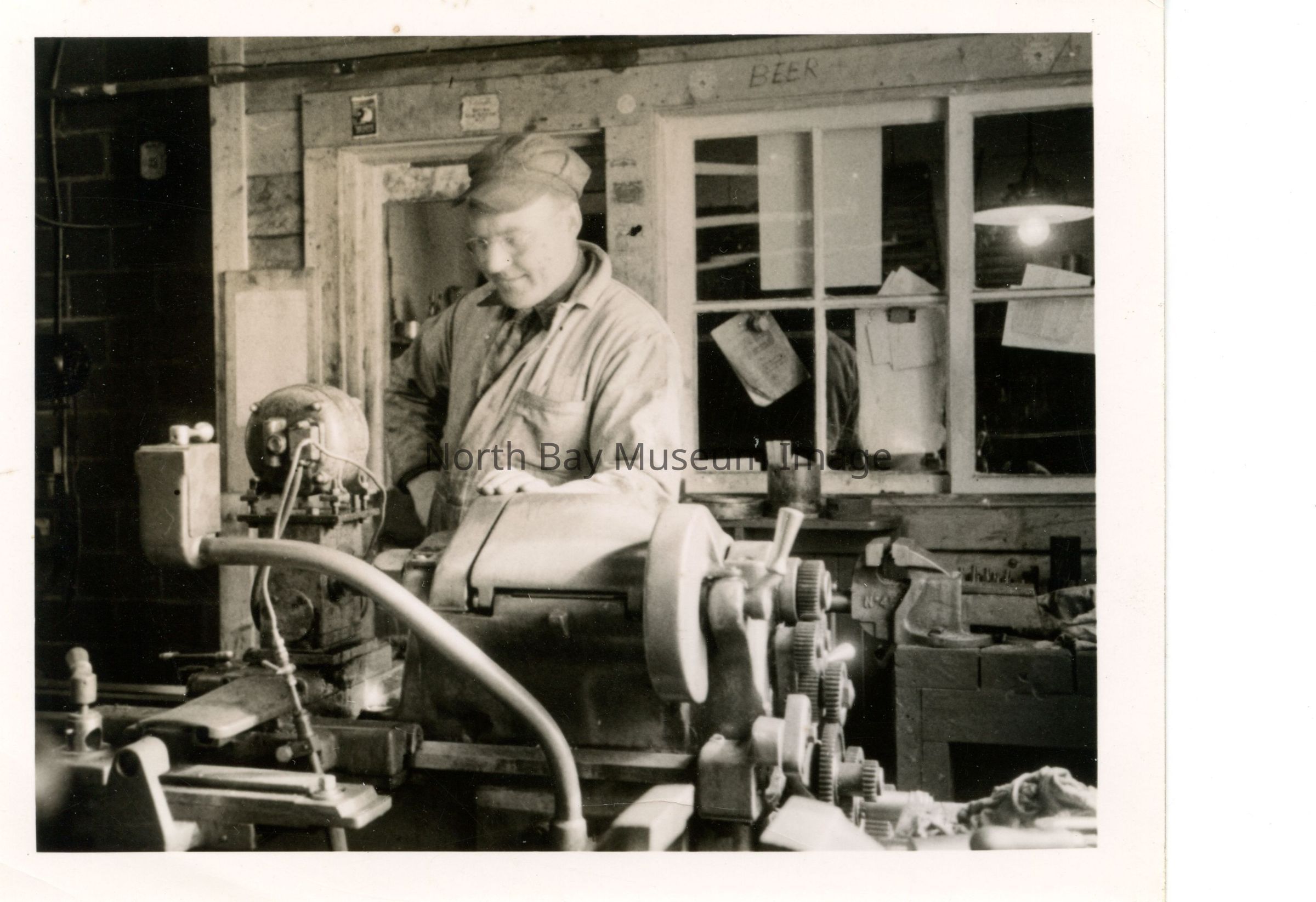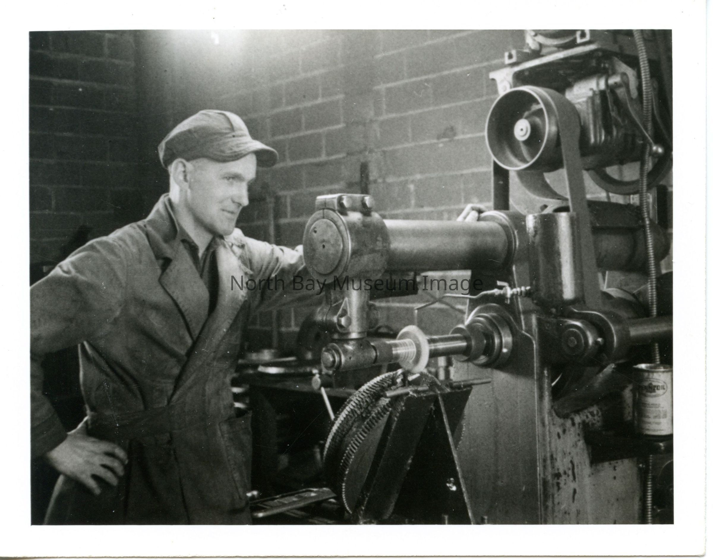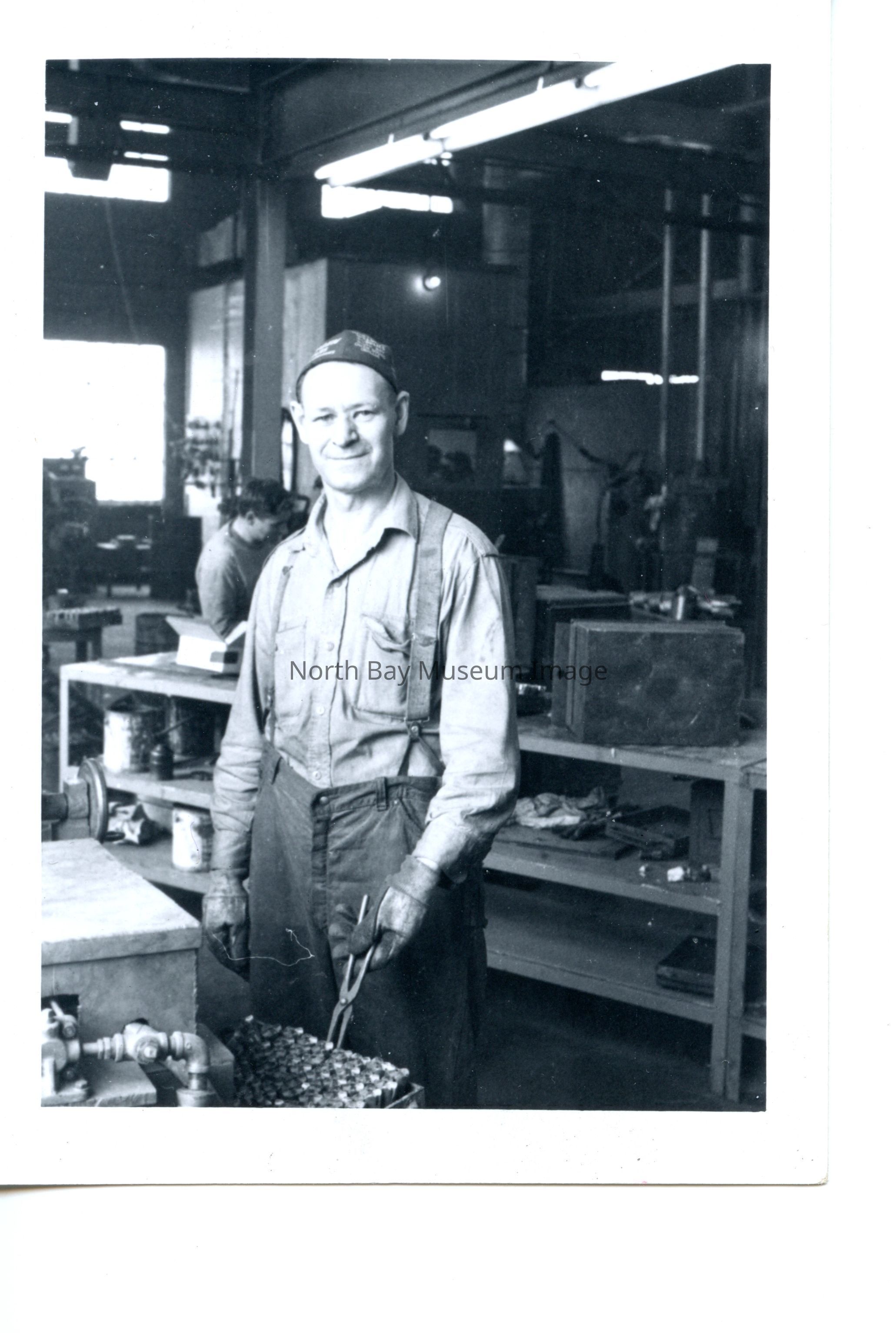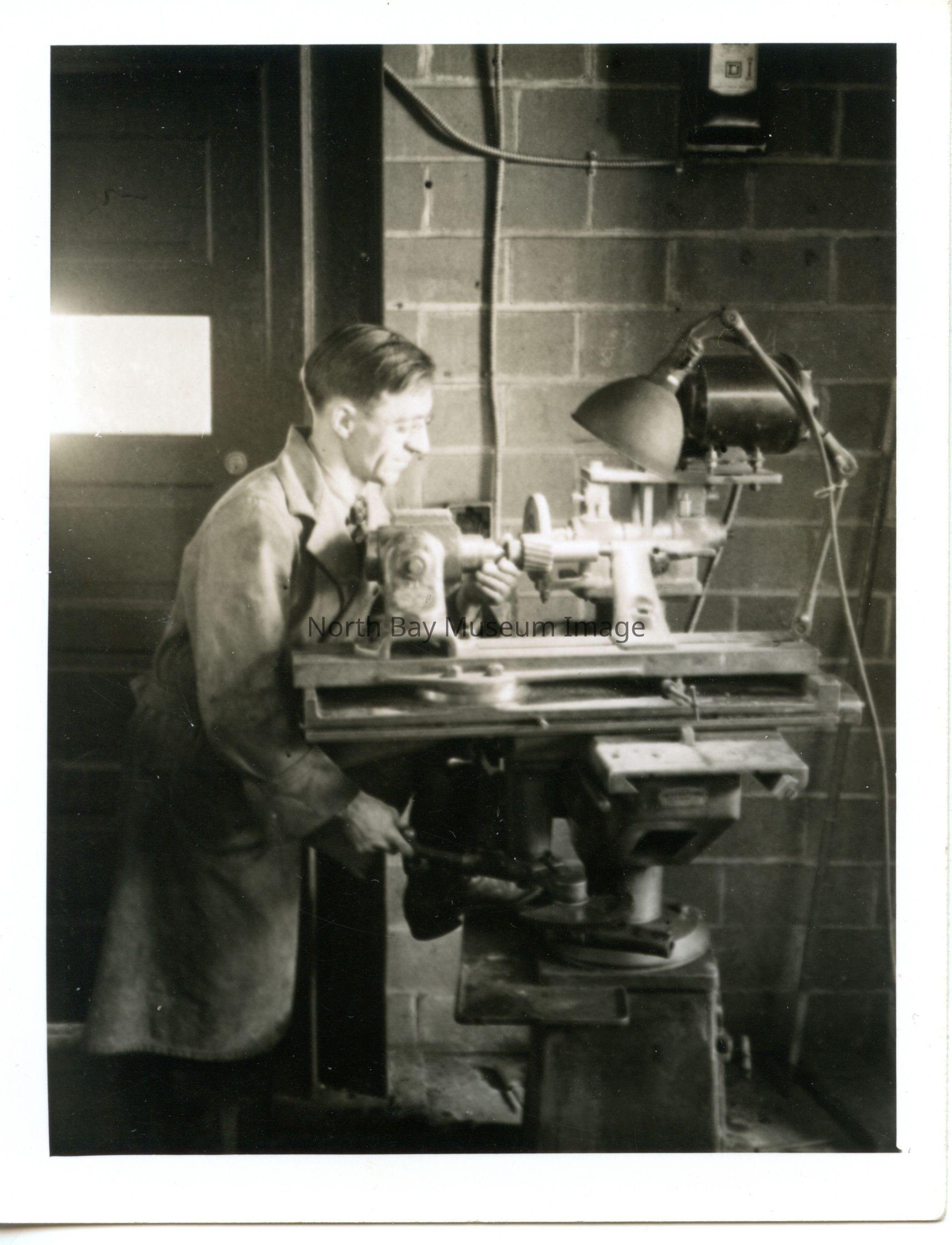 021.01.132: "Gerry Sweet in original toll room in machine shop ( now part of paint shop) in early 1940's."