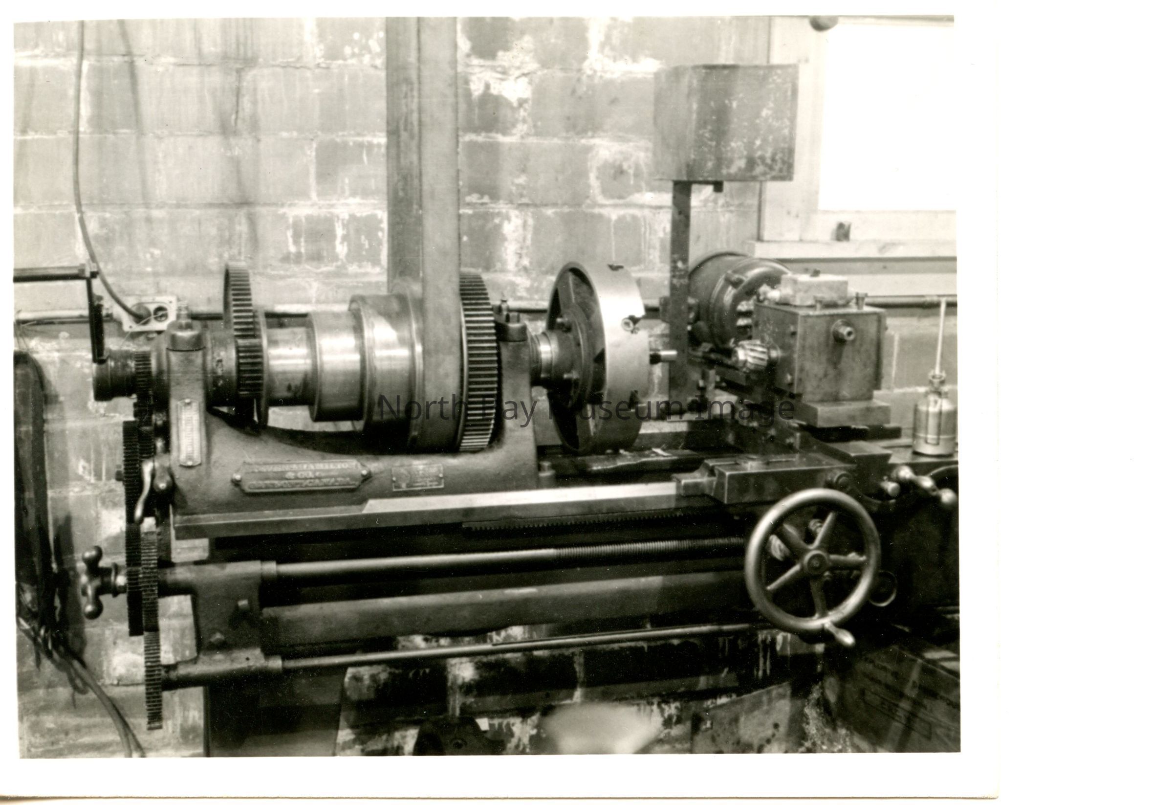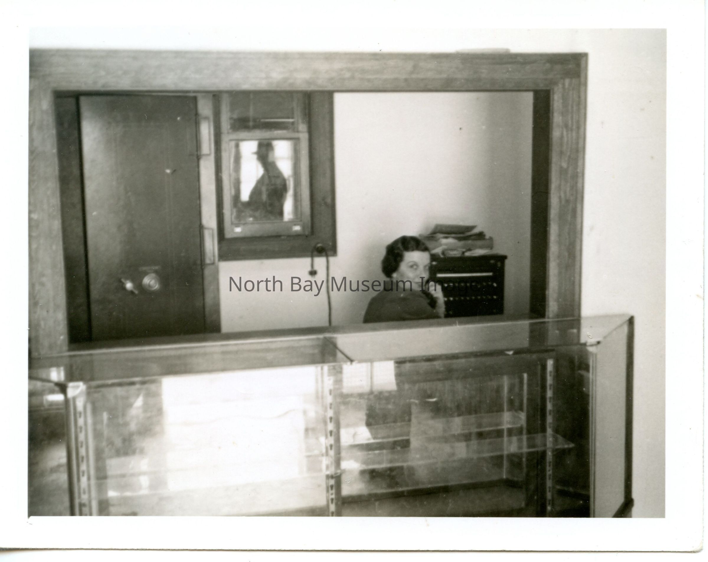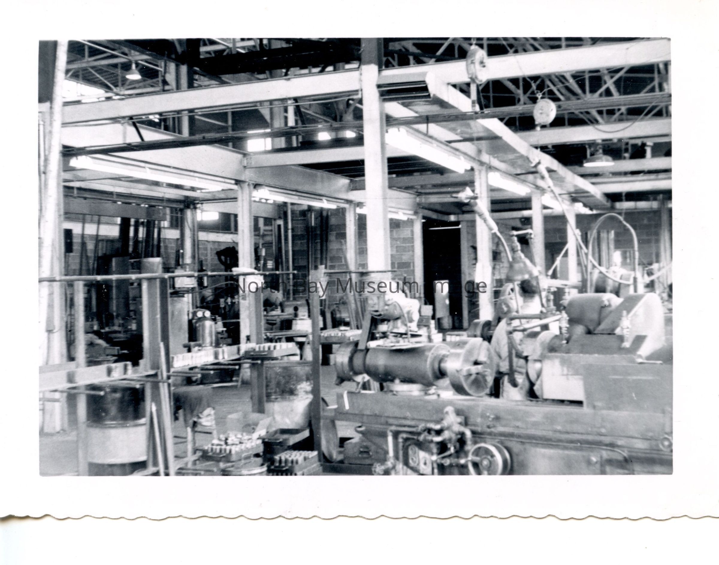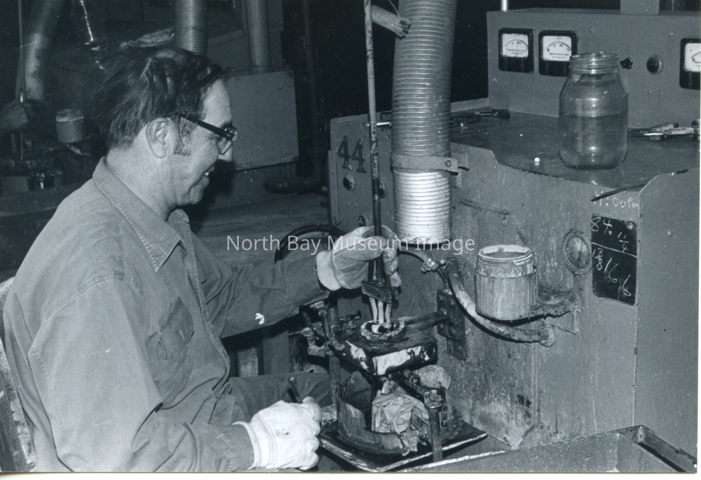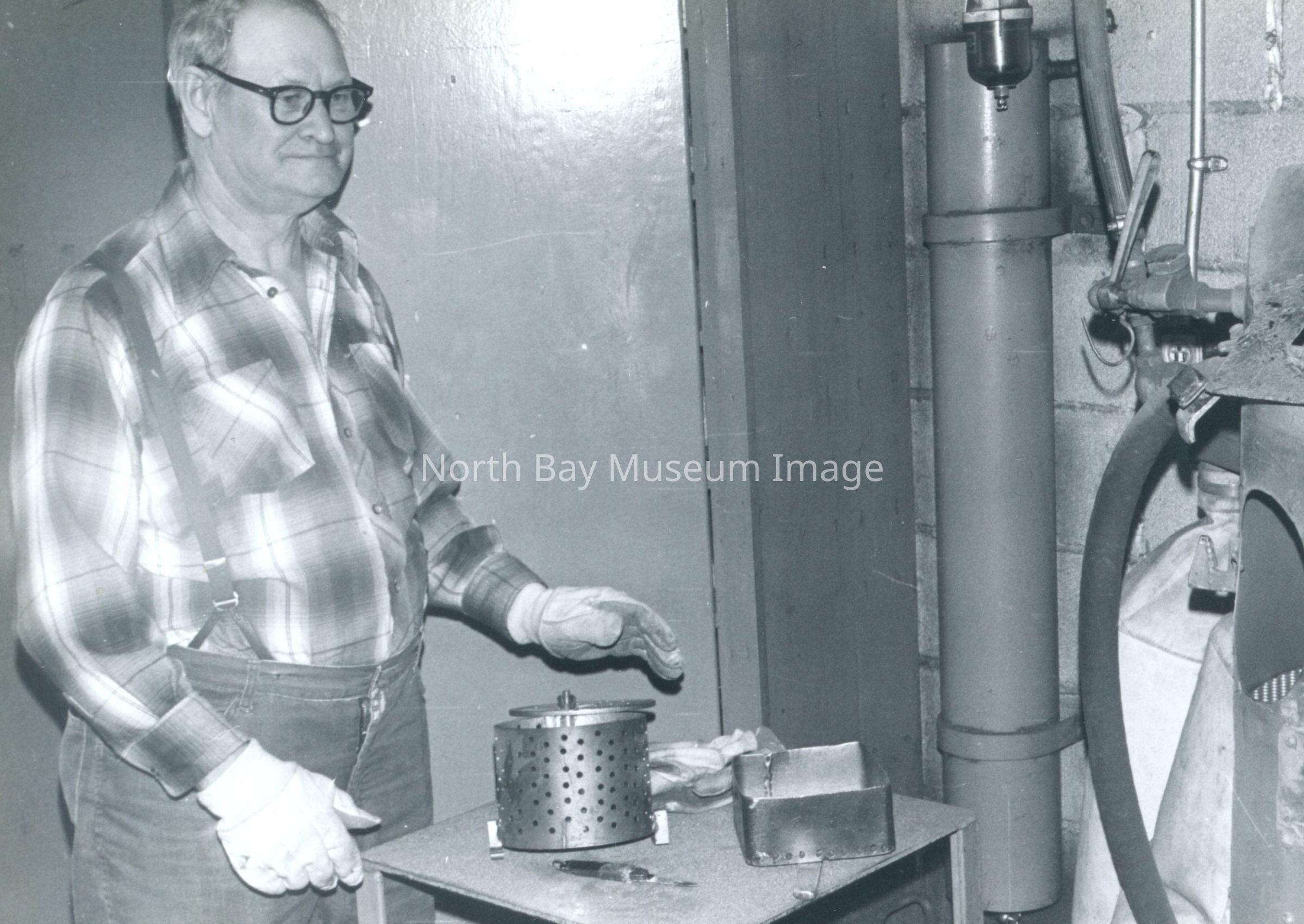 021.01.132: "Gerry Sweet in original toll room in machine shop ( now part of paint shop) in early 1940's."