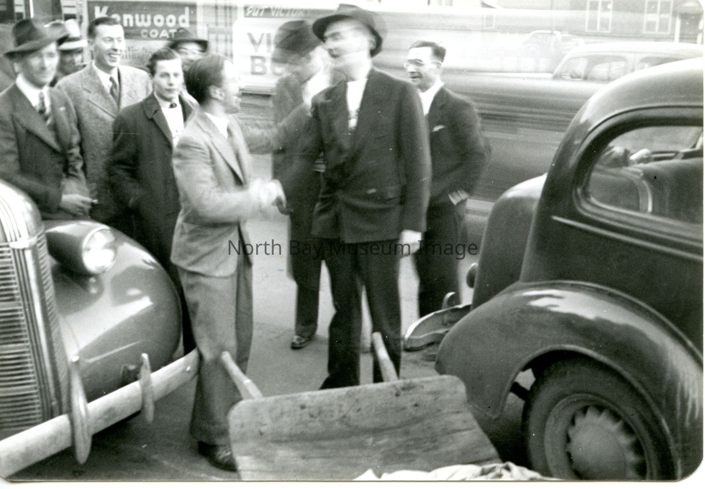 021.01.131: Crowd, men, bantering in downtown. "Lou Rude (second from left)". "Kenwood Coats", "Victory Bonds" sign?