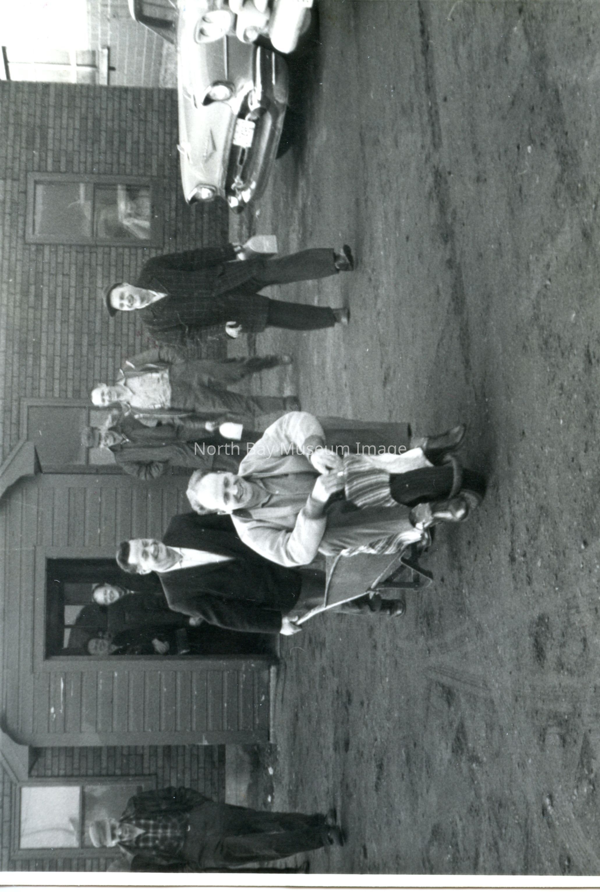 021.01.141-142: Wheelbarrow bet between Bert Knight and Herman LaPorte."Paying Your Bets", "54%", "Laporte (left)", "Doorway Gerry Gurtzan", "Amy Matthew (bucket)", "Bart Knight (now deceased)", "Joke Shop", "now engineers office", "Armand Laporte at Longyear doing the pushing", "1950's", "Right", "Armand Laplante".