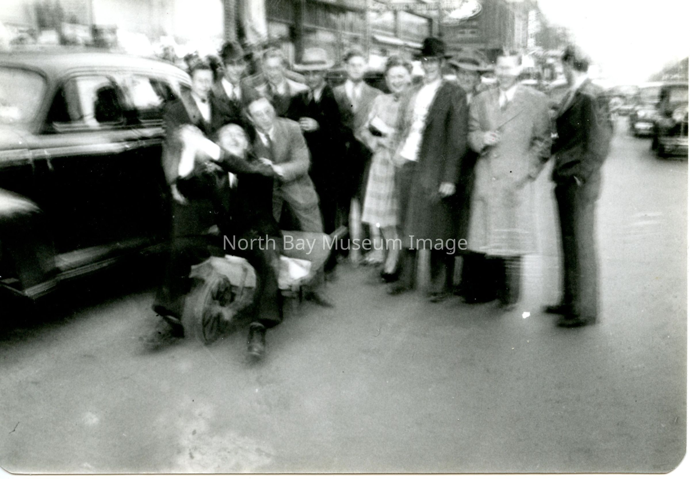 021.01.129: Photo of crowd cheering on two men in a wheelbarrow downtown. "'Hockey bet', in the wheelbarrow", "H.W. 'Buss' day machinist", "Gerry Sweet Machine shop (perhaps) foreman", "1940's", "* Now across from deluxe Tay!", "Craig Bit Bowling Leagues (upstairs at old Arcadian Grill)".
