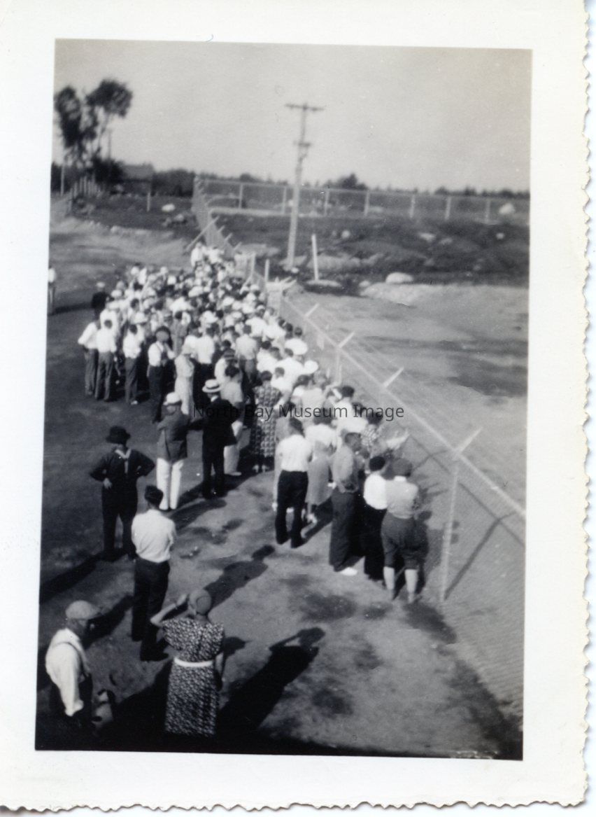 Photographic print - black and white photo of Dionne Home 1935 with people in front of fence