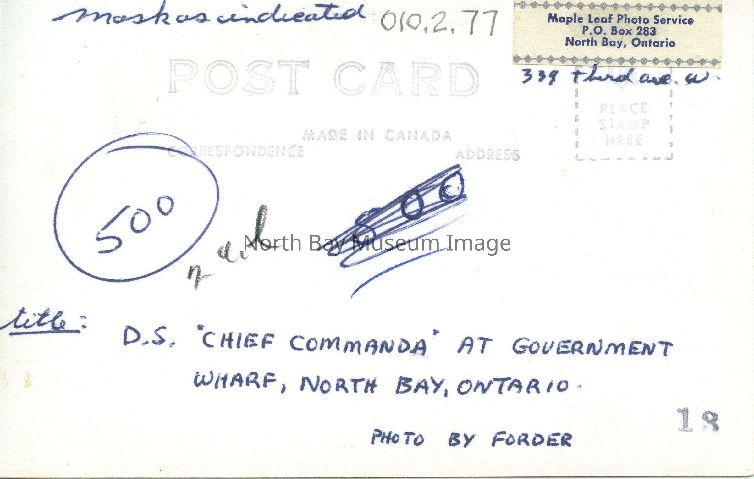 Small address label in upper right corner: Maple Leaf Photo Service, P.O. Box 283, North Bay, Ontario. Handwritten just below this label: 339 Third Ave. W