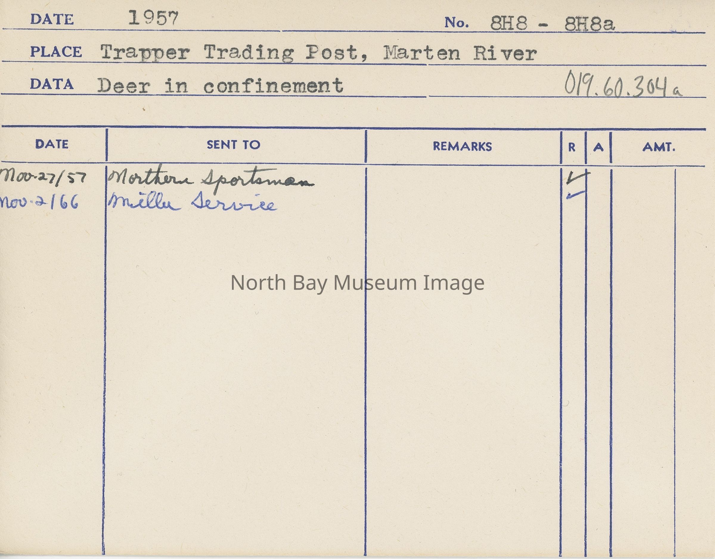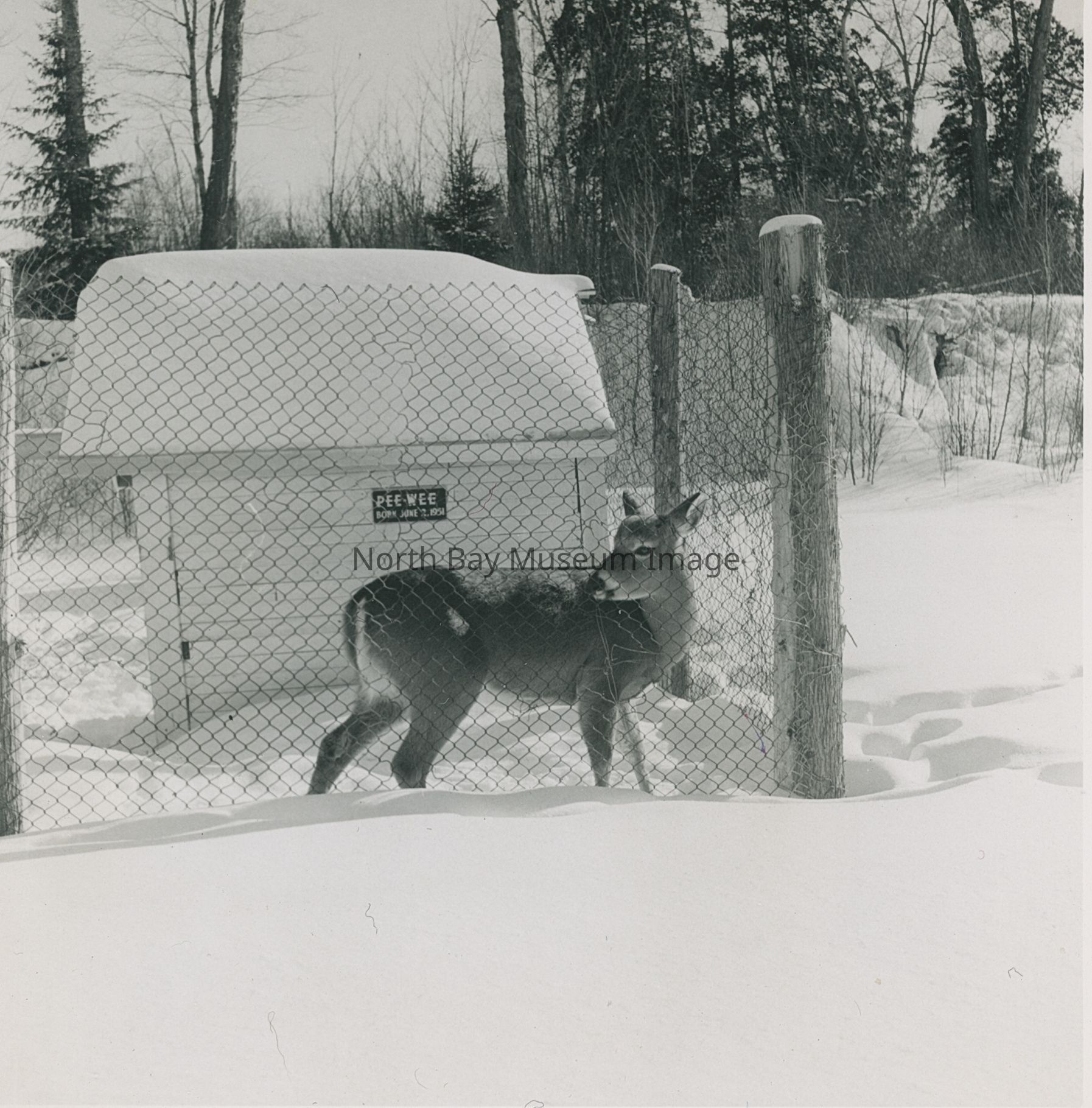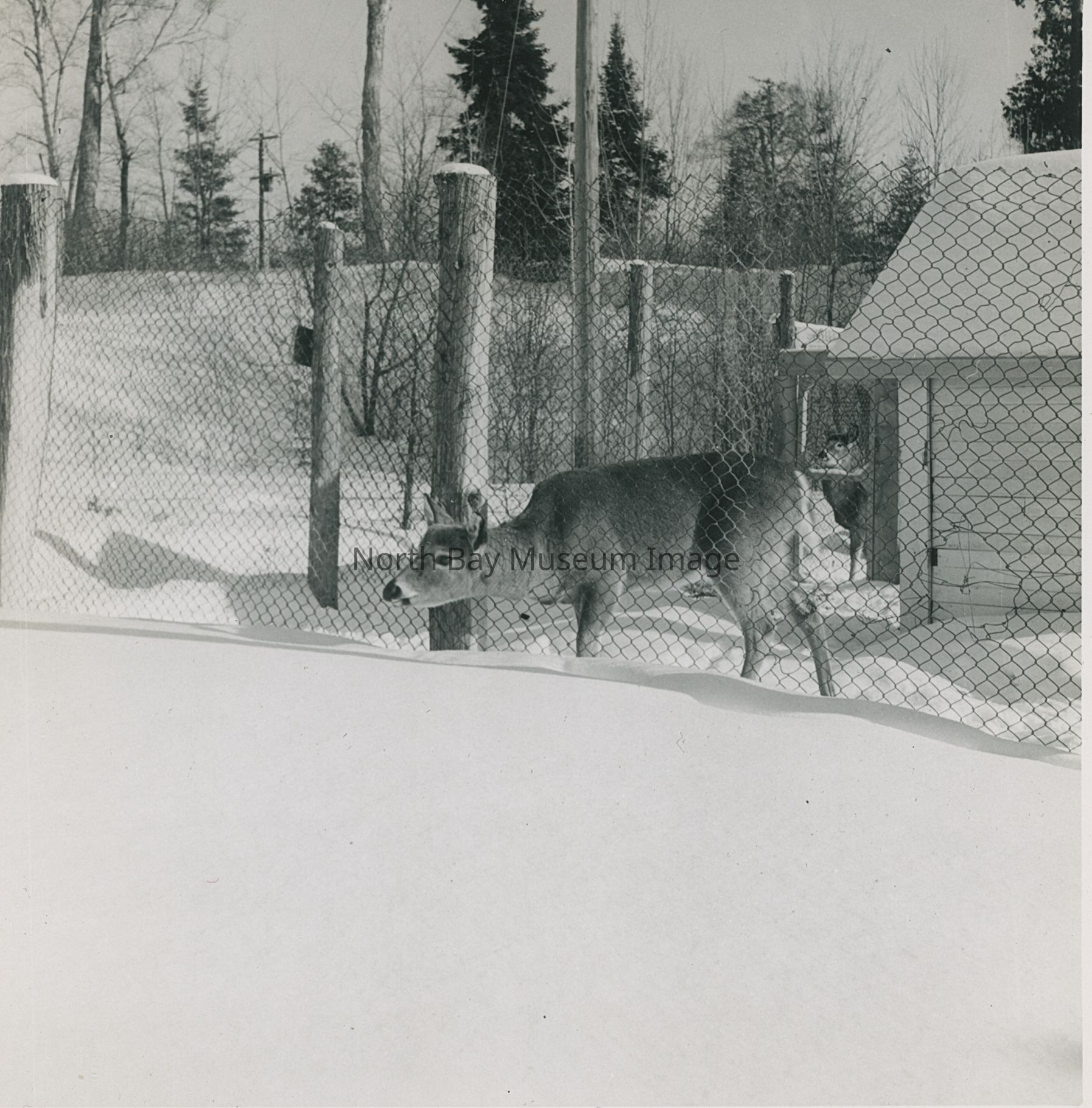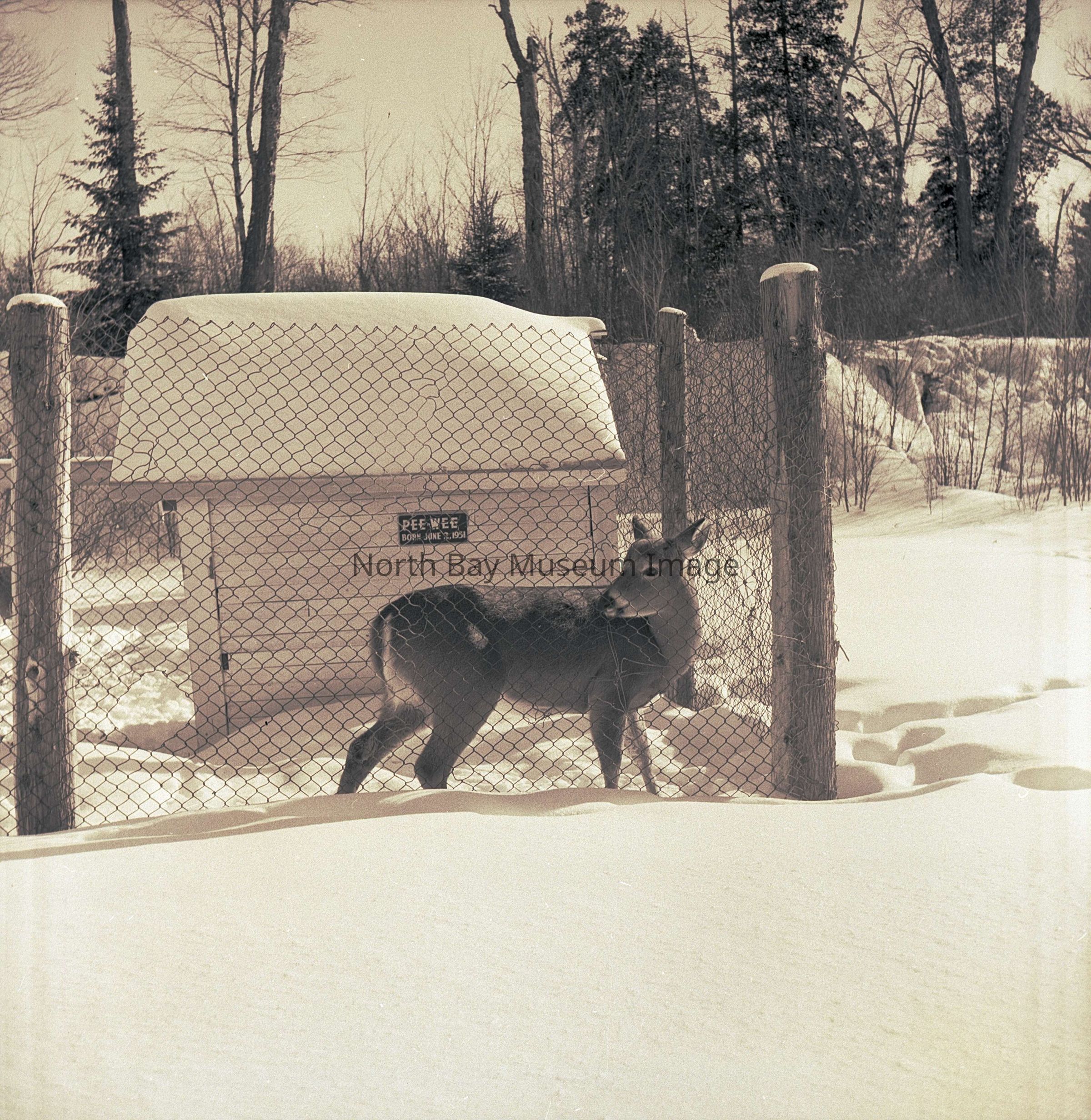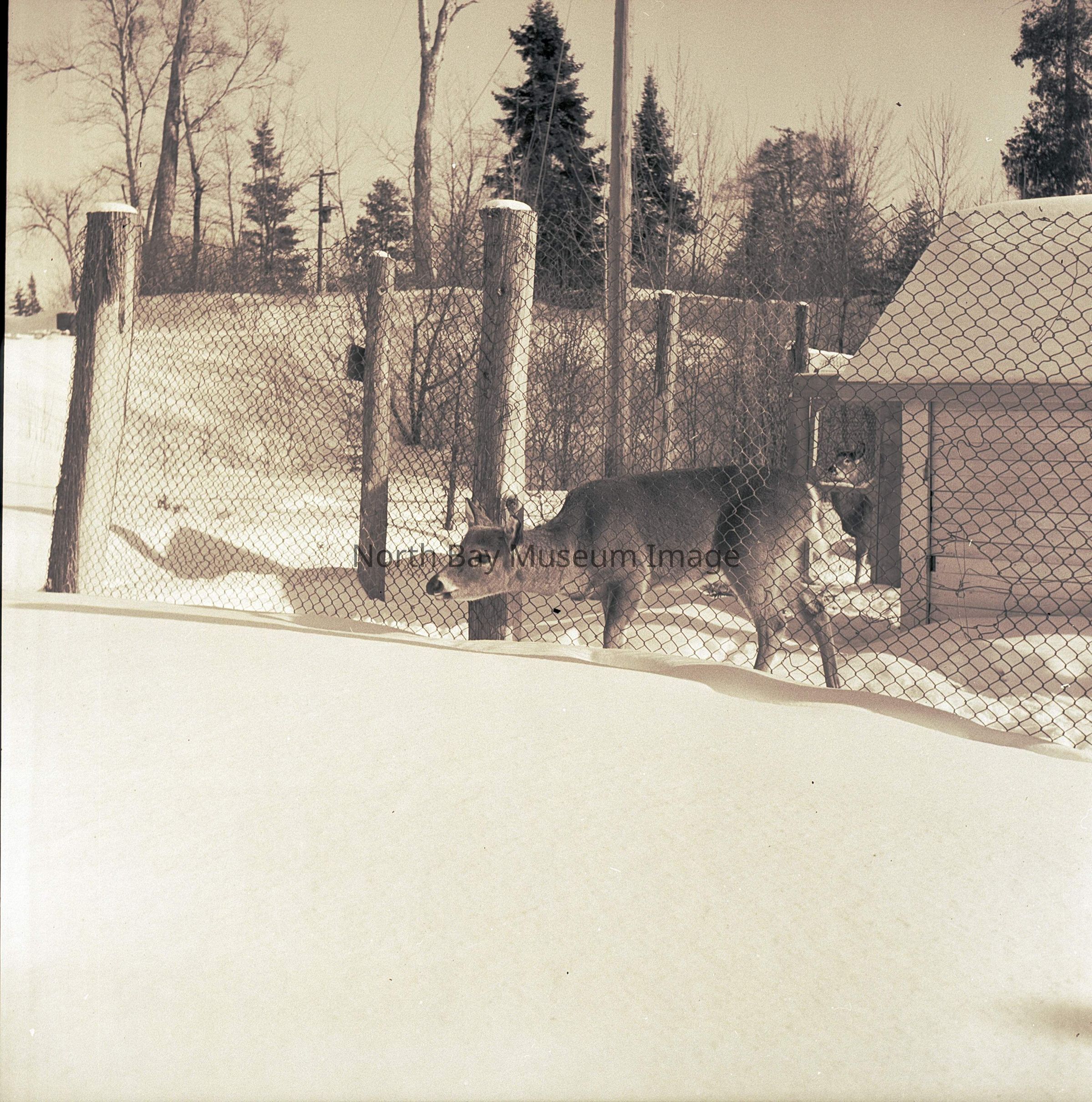 Photographer's Envelope (a) holds prints and negatives (b-e) of a deer in confinement at the Trapper Trading Post in Marten River, 1957.