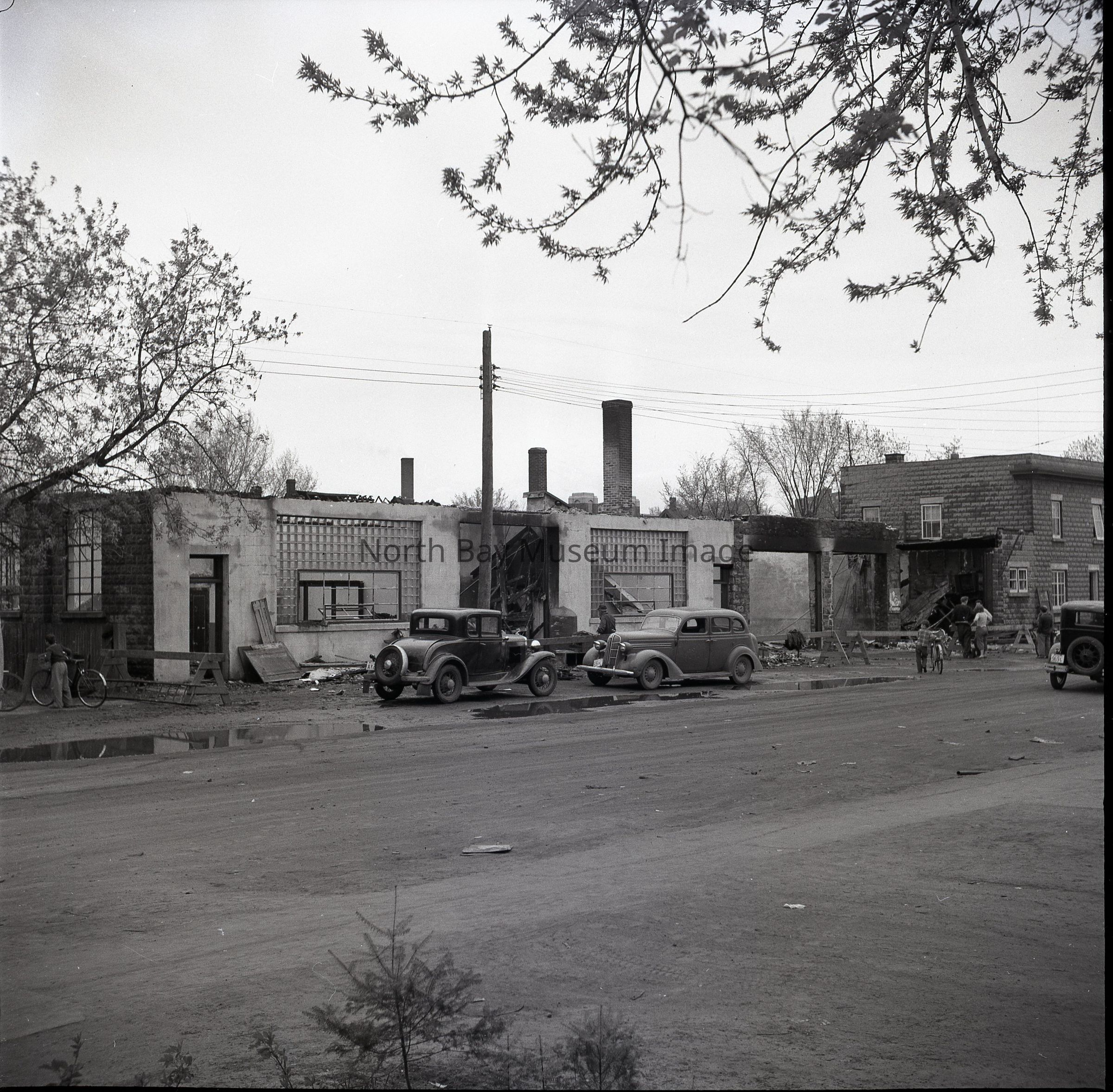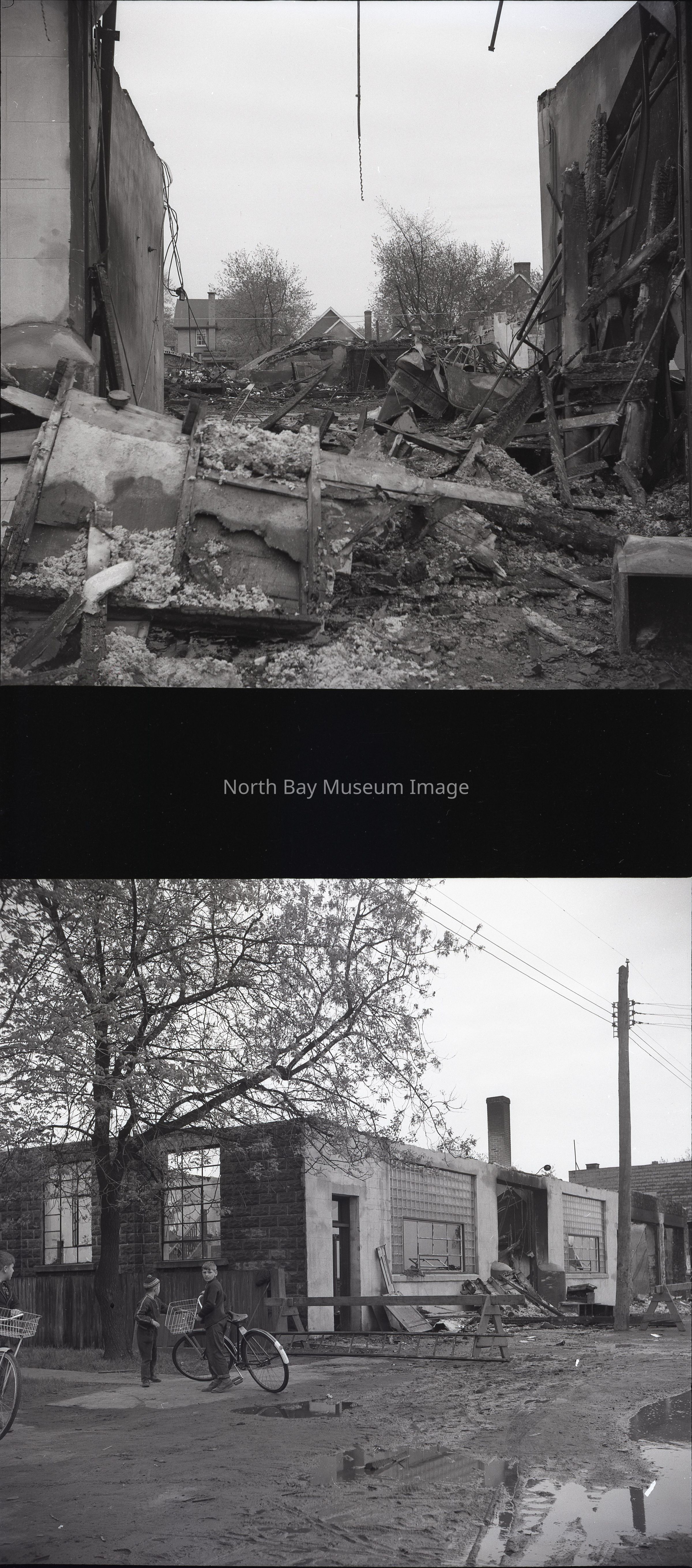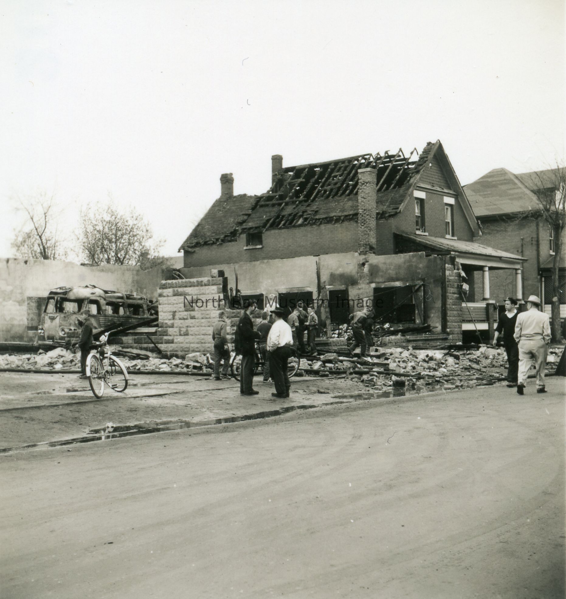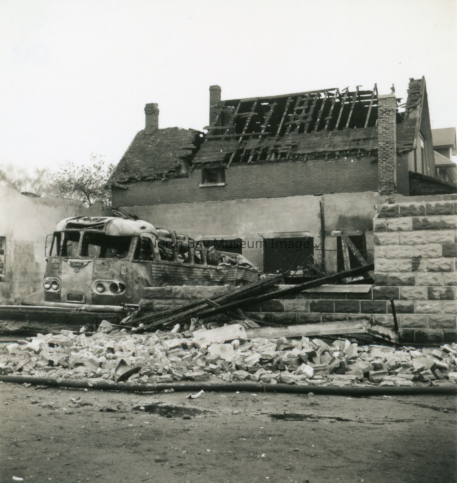 (b/c) Contains two negatives. (b) shows the rubble inside of the building. (c) shows us the outside walls still standing, with two children in front. (d/e) Contains two negative. (d) taken at a different angle, this time showing a house next to the building with the roof affected. (e) shows us a similar angle, this time zoomed out, people in the shot. (f/g) Contains two negatives. Negative (f) shows a different angle of the corner with the house, unveilling that there is a burnt bus in the building. People standing in the shot. Negative (g) shows different angle of building, shot taken through a window to show the inside damage. (h/i) Contains two negatives. Negative (h) shows the entire length of the building, similar angle as negative (c), some cars parked infront. Negative (i) shows a single person watering down a large pile of rubble, faily close up. (j/k) Contains two negatives. Negative (j) shows the length of the building again, different angle, people standing in front. Negative (k) is similar negative to (f), different angle. (l/m) Contains two negatives. Negative (l) shows again inside the building rubble, showing some old cars inside as well. Negative (m) shows the same bus as before, different angle. Picture (n) is negative (b). Picture (o) is negative (c). Picture (p) is negative (d). Picture (q) is negative (e). Picture (r) is negative (f). Picture (s) is negative (g). Picture (t) is negtive (h). Picture (u) is negative (i). Picture (v) is negative (j). Picture (w) is negative (k). Picture (x) is negative (l). Picture (y) is negative (m). A part of the Forder Collection. All the publications of the images are written on the envelope.Creator