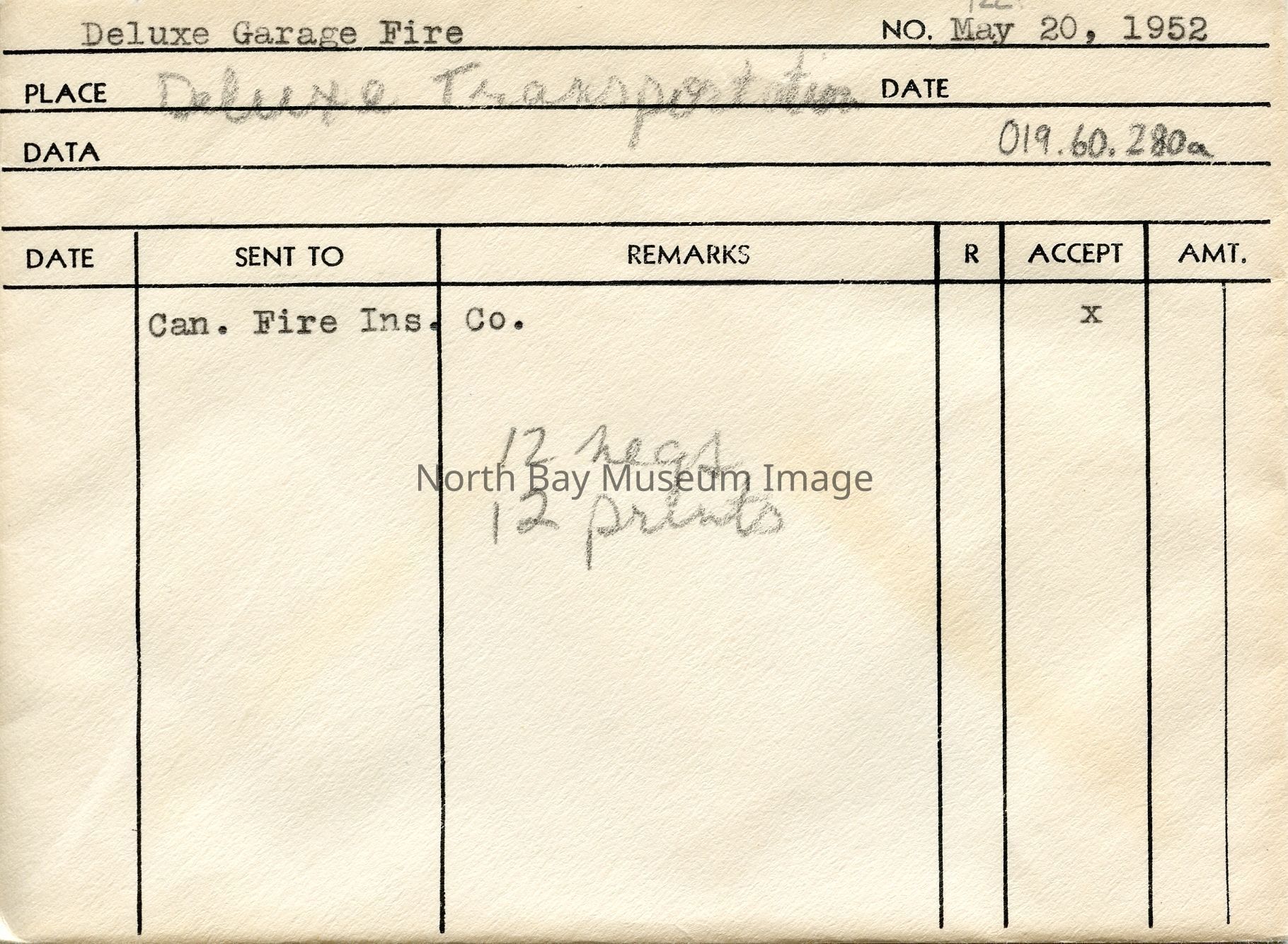 Photographer's Envelope (a) contains the photographs and negatives (b-y) of the Deluxe Garage Fire at Deluxe Transportation on May 20, 1952.