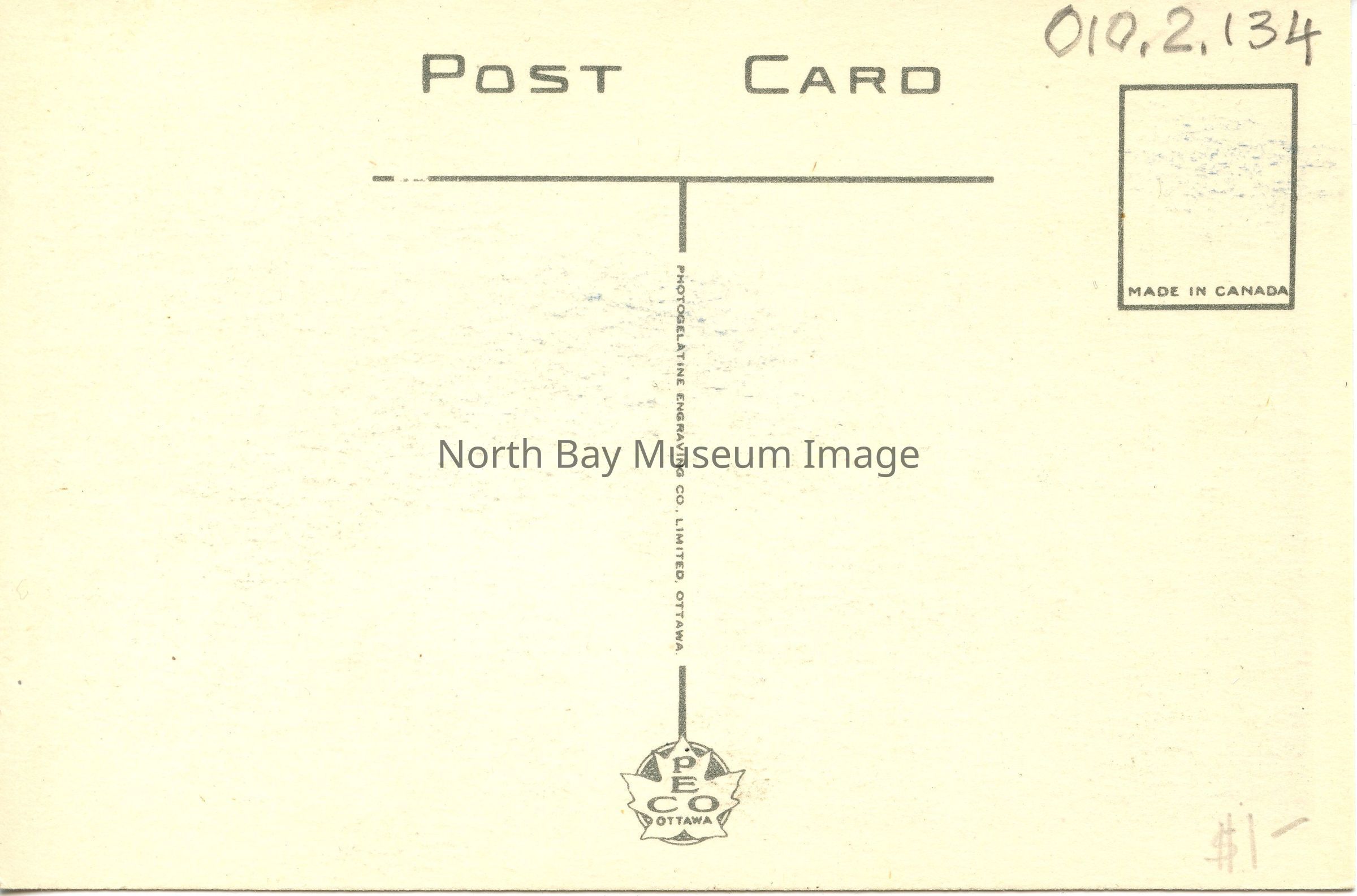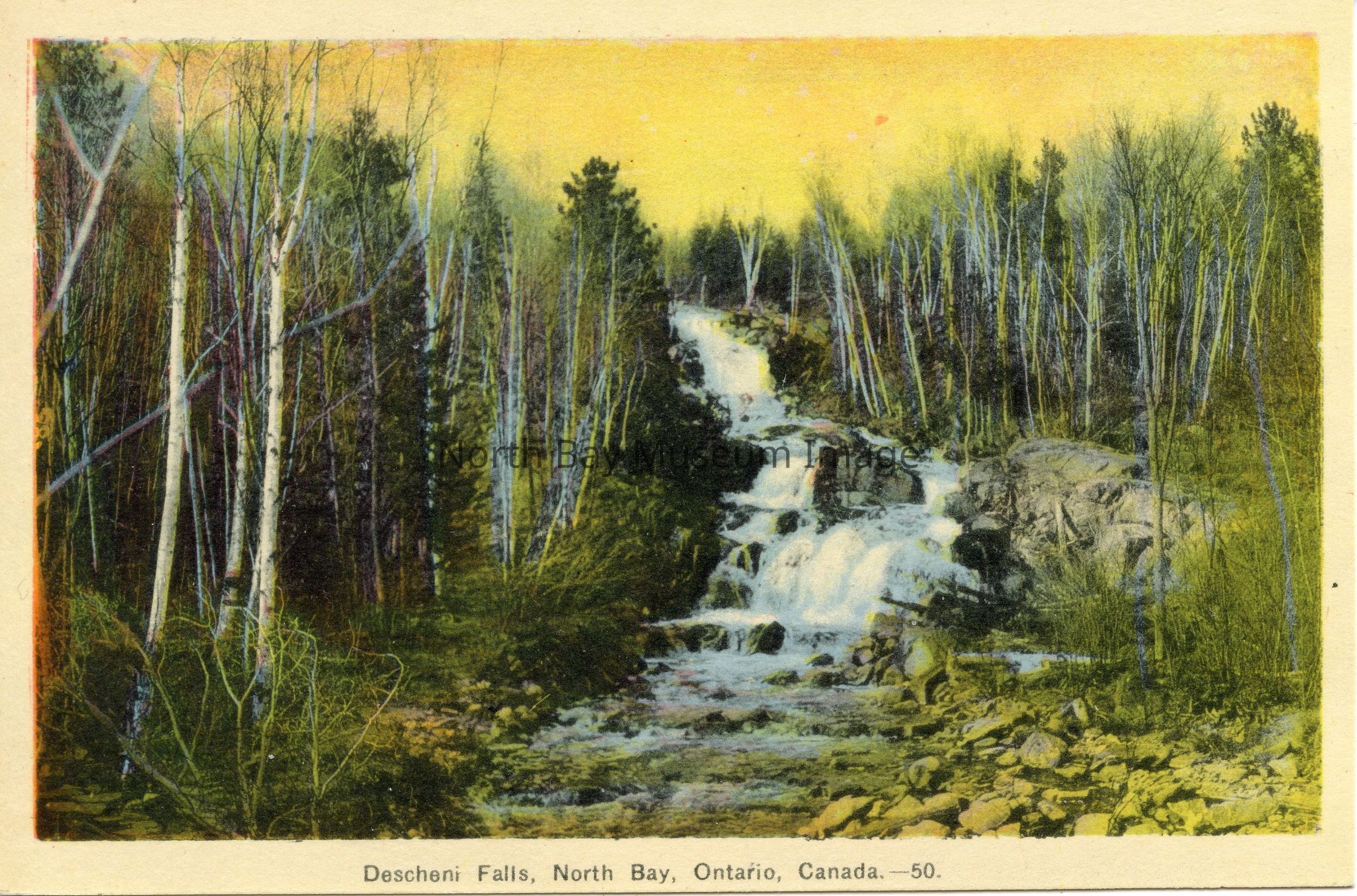 Postcard with color photo of "Descheni" (Duchesnay) Falls, North Bay. Color of sky is yellow in this photo.
