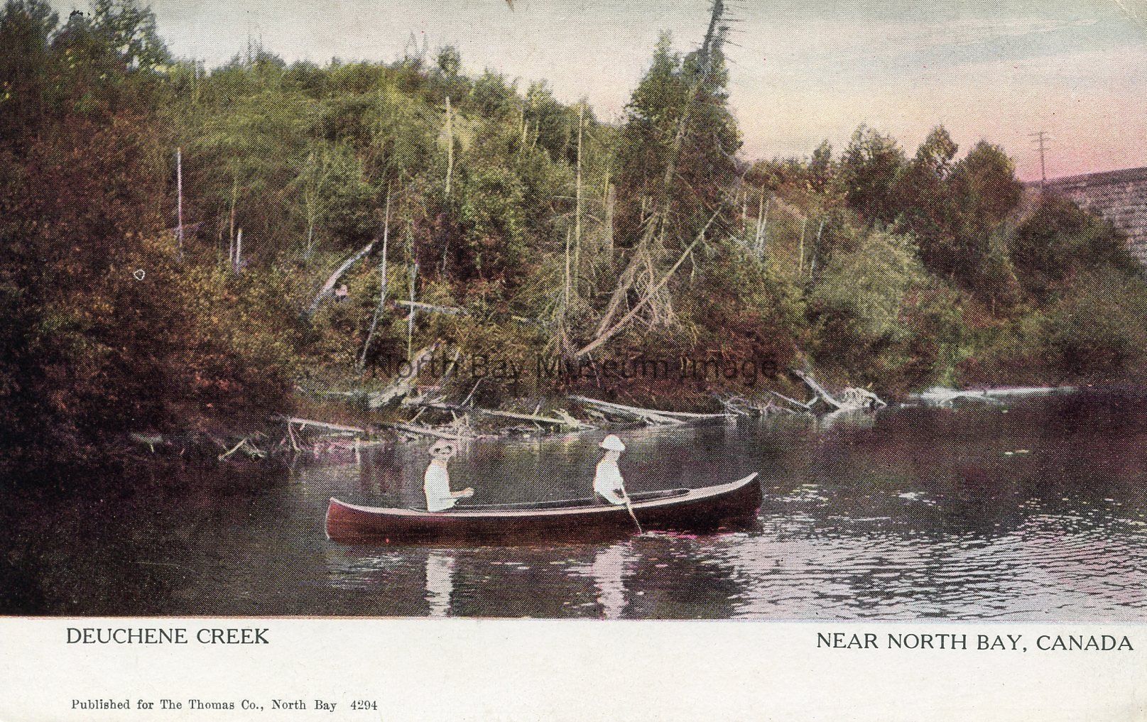 This is a coloured post card. The front of the postcard shows a canoe with two people paddling down Deuchene Creek. There is a hill on the shore line has several dead trees, and logs with a brick building to the right.