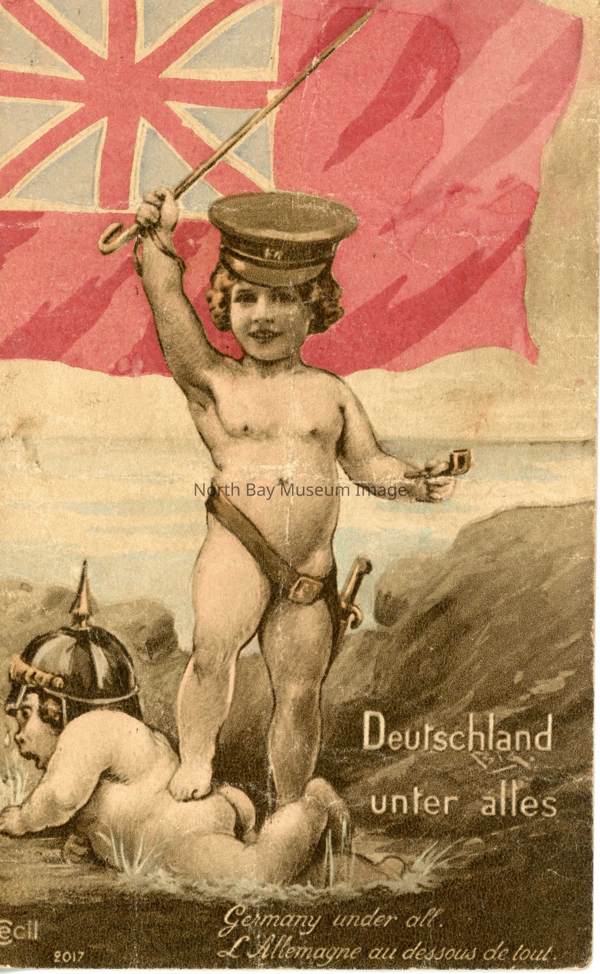 Coloured postcard of naked child with foot on another naked child. "Deutschland Under Allies" is written across the bottom. On Back "Edition SID PARIS" Part of Souter Collection.