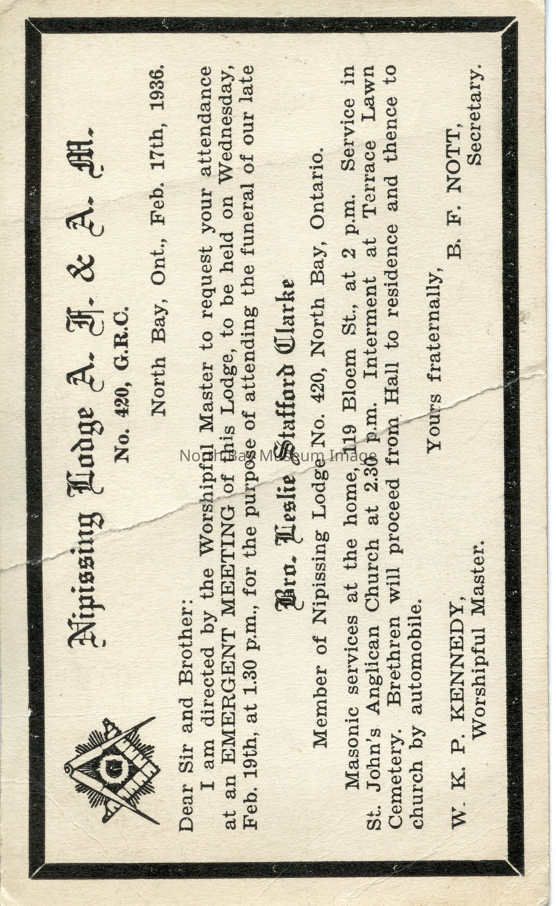 Request for attendance at an emergent meeting of the lodge to be held February 19 to attend the funeral of Bro. Leslie Stafford Clark, member of the lodge.