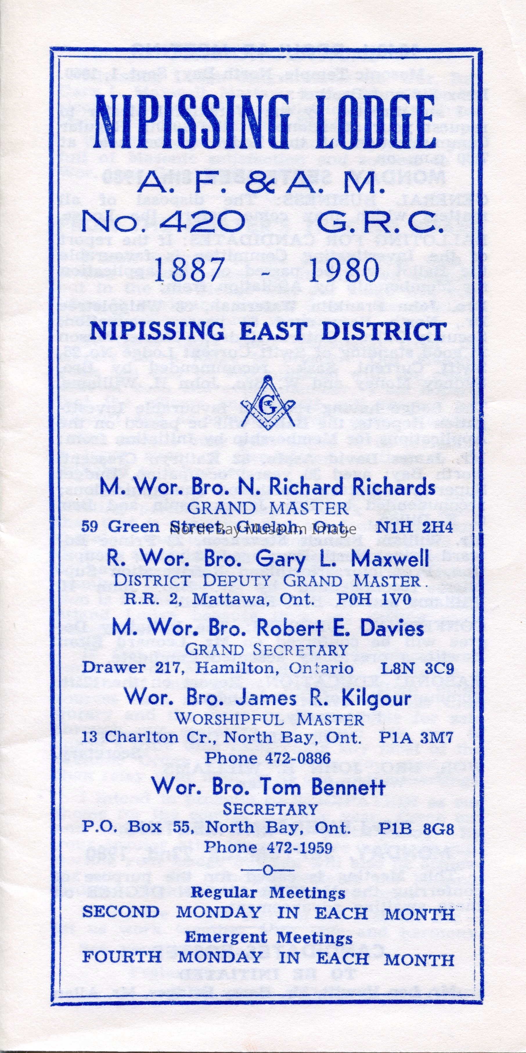 Listing of committees, events, and current and past masters and officers of the lodge. For the Nipissing East District Lodge 420 which held regular meetings the 2nd Monday of the month and emergent meetings the 4th Monday of the month.
