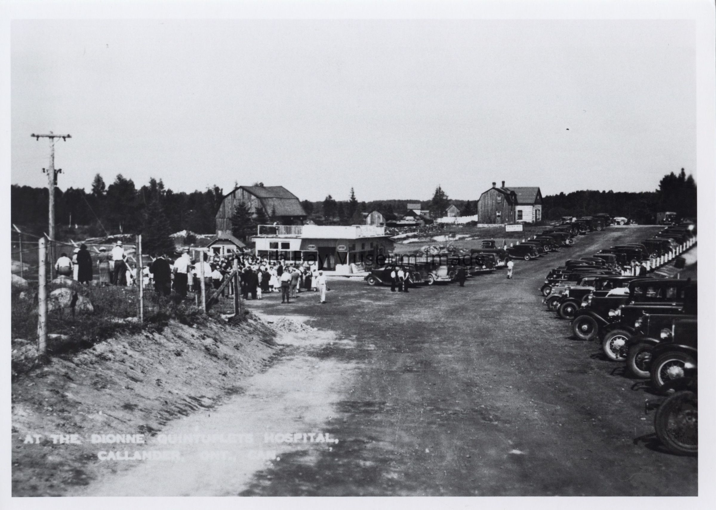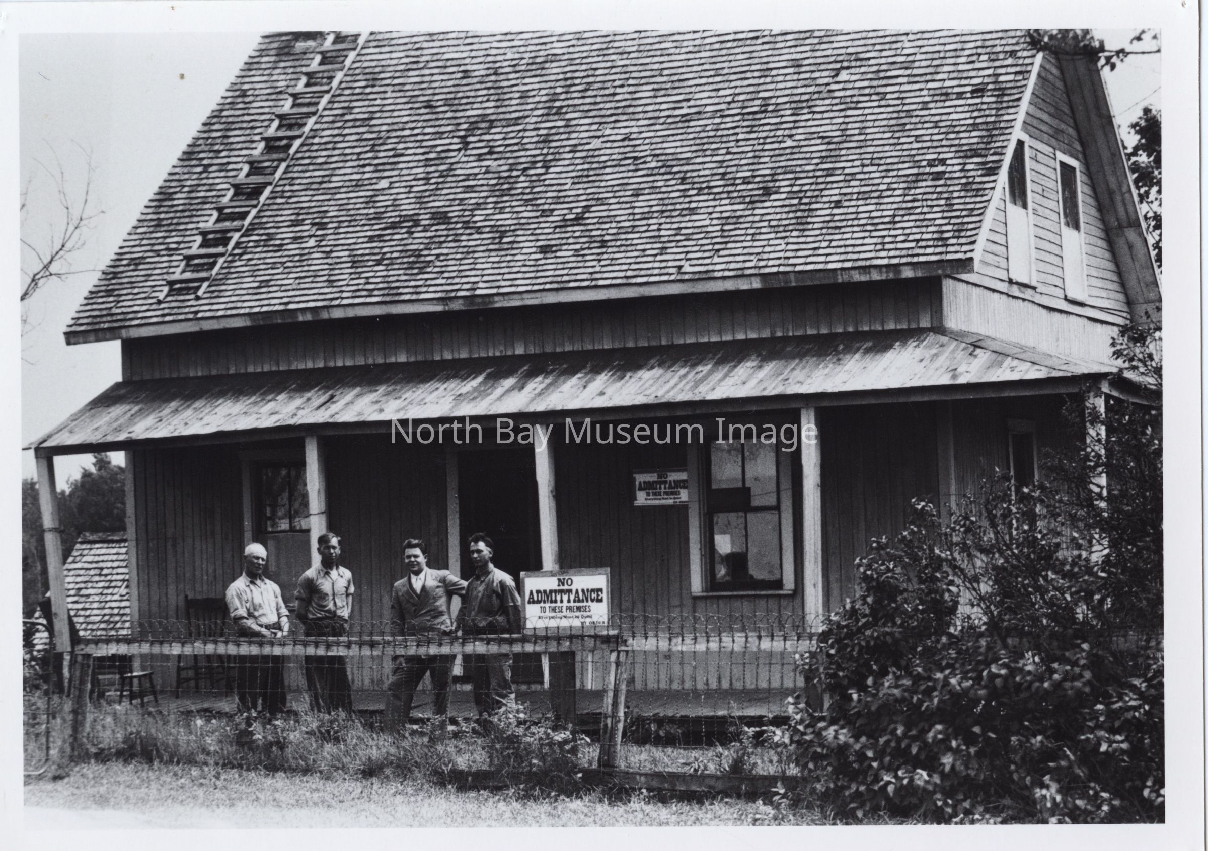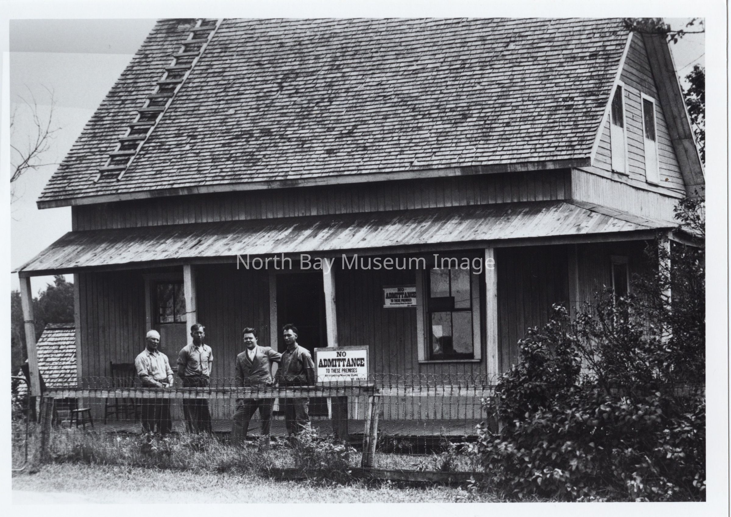 023.20.22b: 4 men in front of Dionne Quintuplets house with "No Admittance" sign.