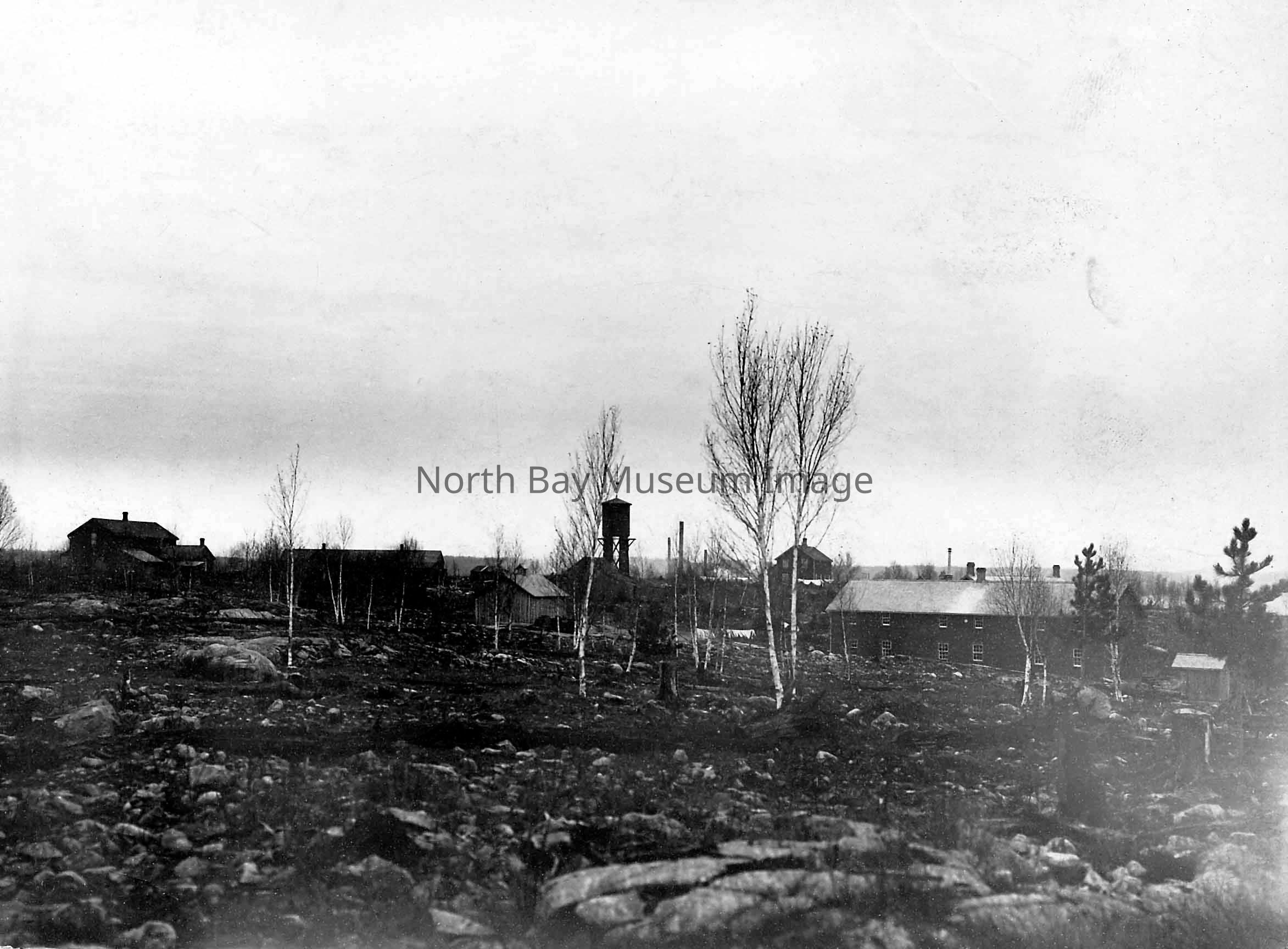 Black and white photographic print of John B.Smith & Sons Ltd. Mill property in Callander. A dark image of wood frame buildings on rocky land with sparse birch trees.