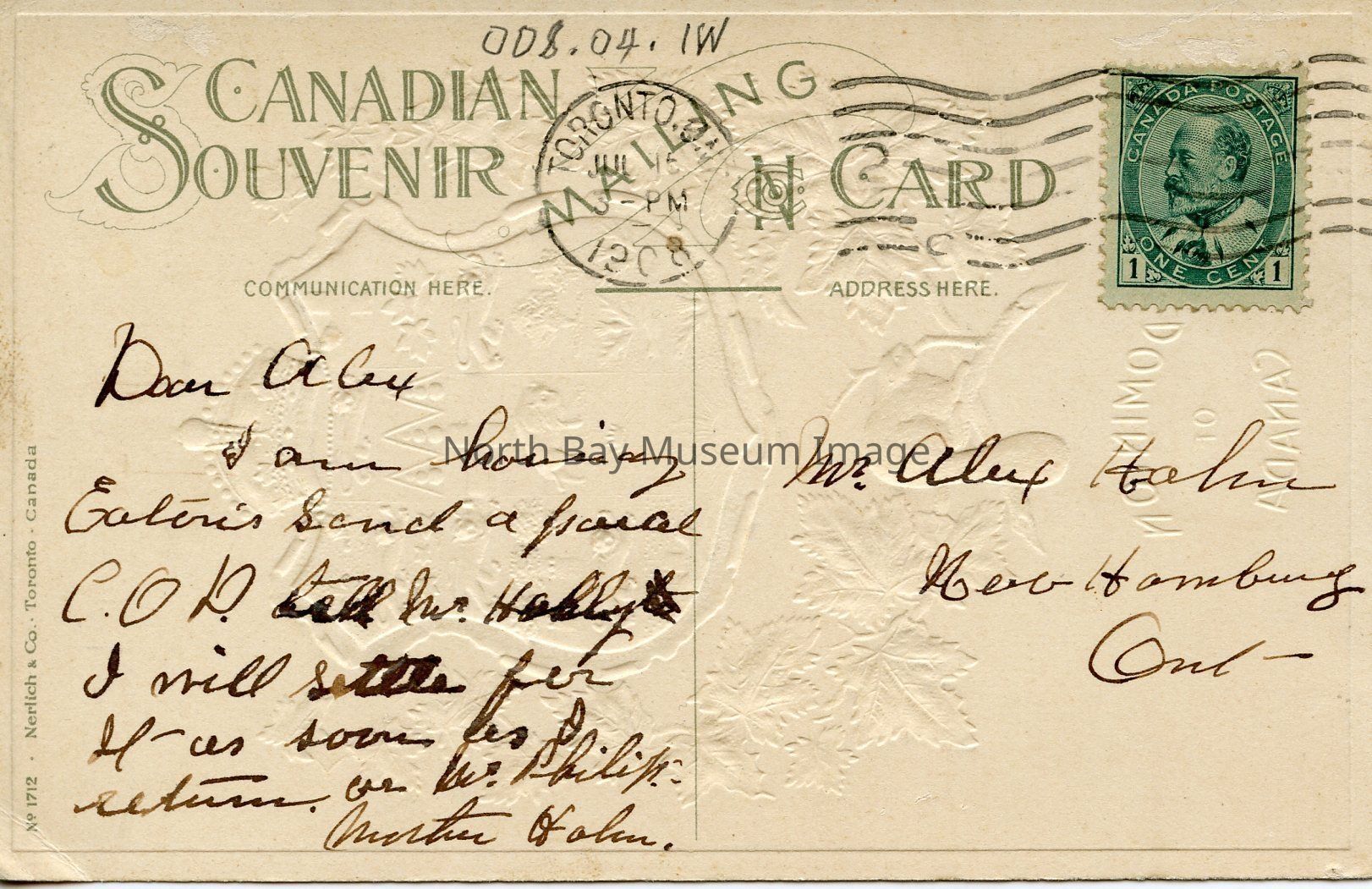 The back of the postcard has "Canadian Souvenir Card" written on the back. As well as "green one cent stamp and Edward V11." There is also handwriting on the back in black ink. It says