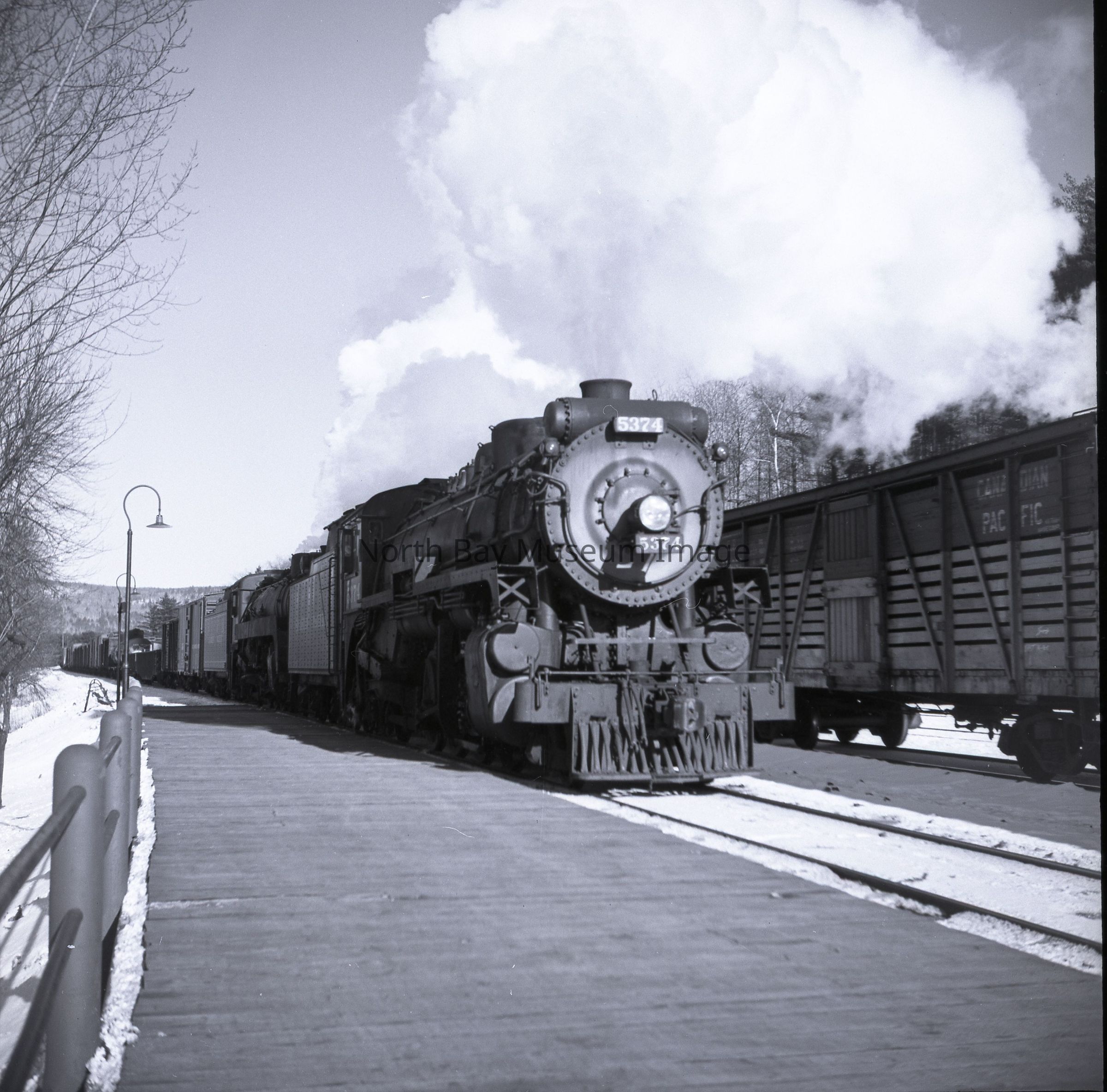 019.60.574a-b is a Envelope and negative. (a) is the envelope with the inscriptions "11K25. CPR Engine 5374 + 2nd Engine, Westbound - Mattawa Station, March 1, 1953." (b) is the Negative. The negative was taken looking straight at the train. The train appears to be stopped? On the right hand side of the photograph it appears that there is another train parked.Creator