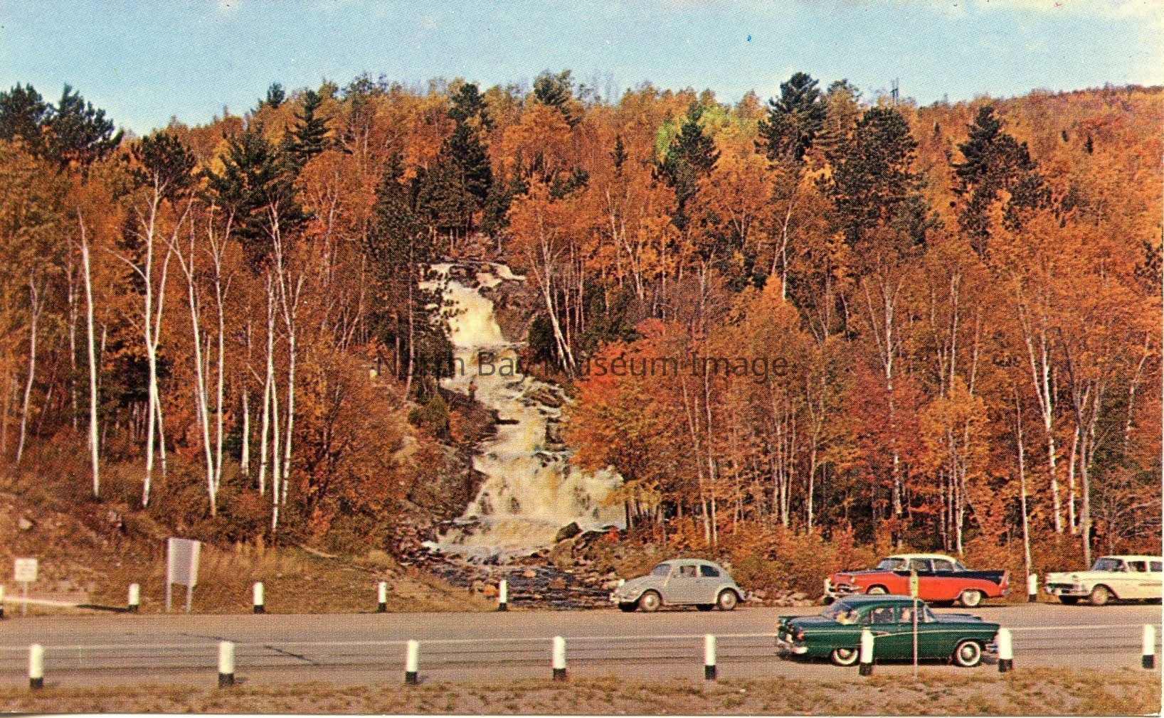 This postcard is of Duchesney 'SHEENY' Falls. This image is taken from Trans-Canada Highway 17 at Western Entrance to North Bay, Ontario, Canada. You can clearly see the rushing waterfall as there is no trees obstructing the view of the waterfall. It appears to be fall as all the trees leaves are orange and red. You can see old cars parked in front of the Falls.Creator