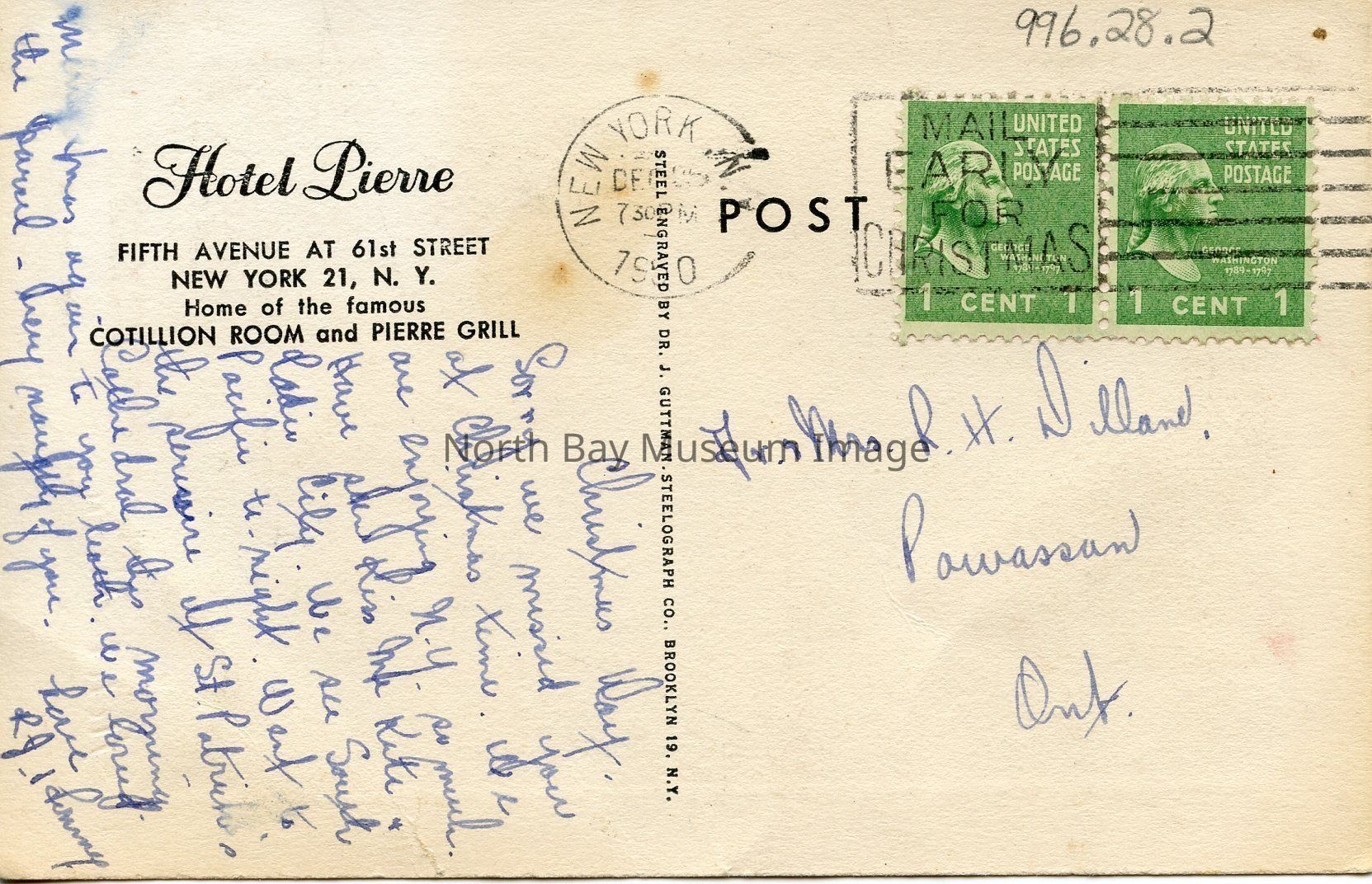 On the back of the postcard is writing in blue ink. This postcard was sent to Powassan, Mr and Mrs R.H. Dillard. This postcard was written on Christmas Day. in the message reads "People R.J. and Lonny are enjoying their trip." Also they saw "Kiss Me Kate" and will see "South Pacific". There is two one-cent U.S.A stamps on the back of the postcard. There is black lines cancelling the stamps out. This postcard is postmarked in 1950.