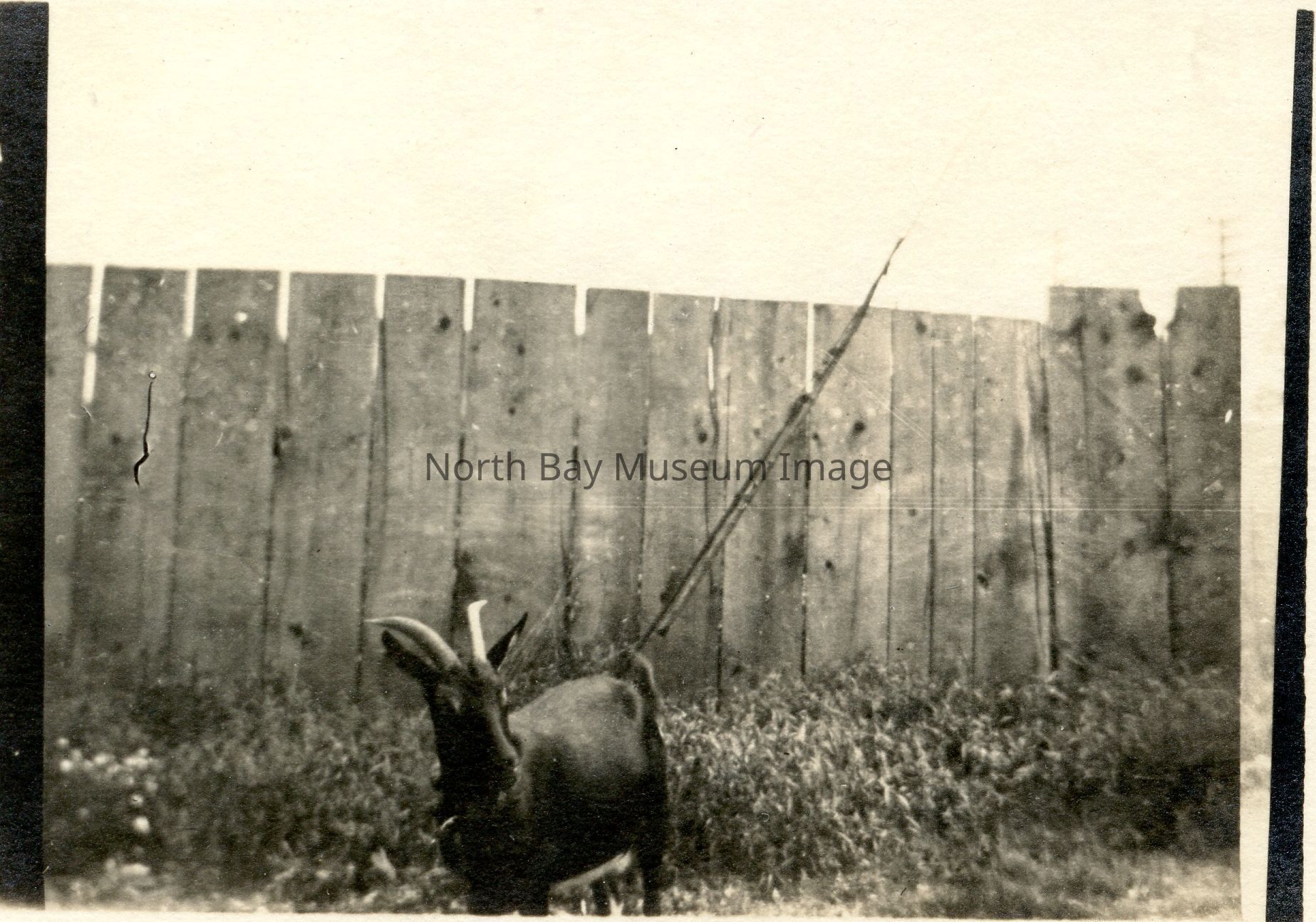 Photo of goat in wood fenced area, captioned as Cavello's goat. Found in Muldoon photo collection.