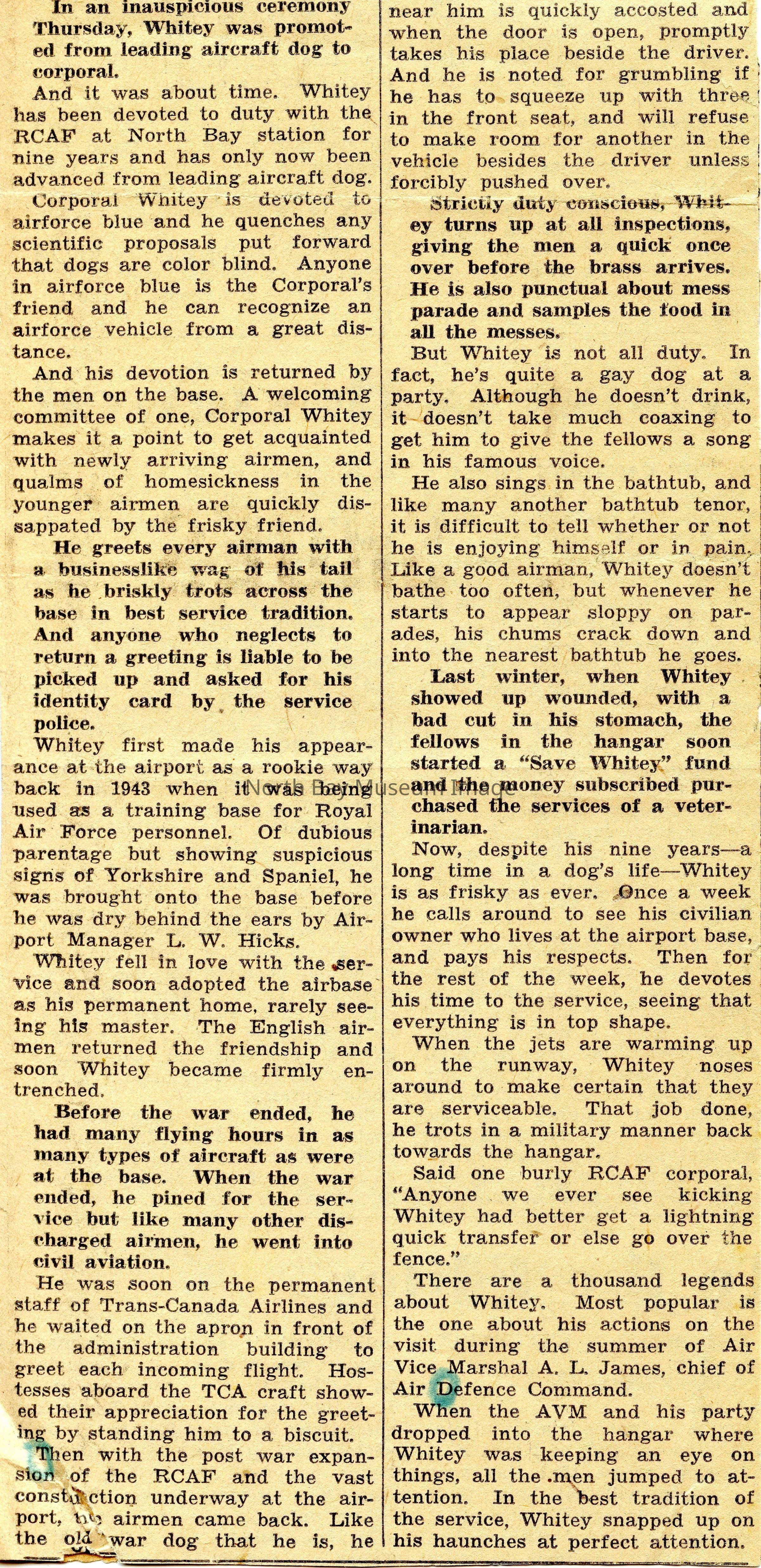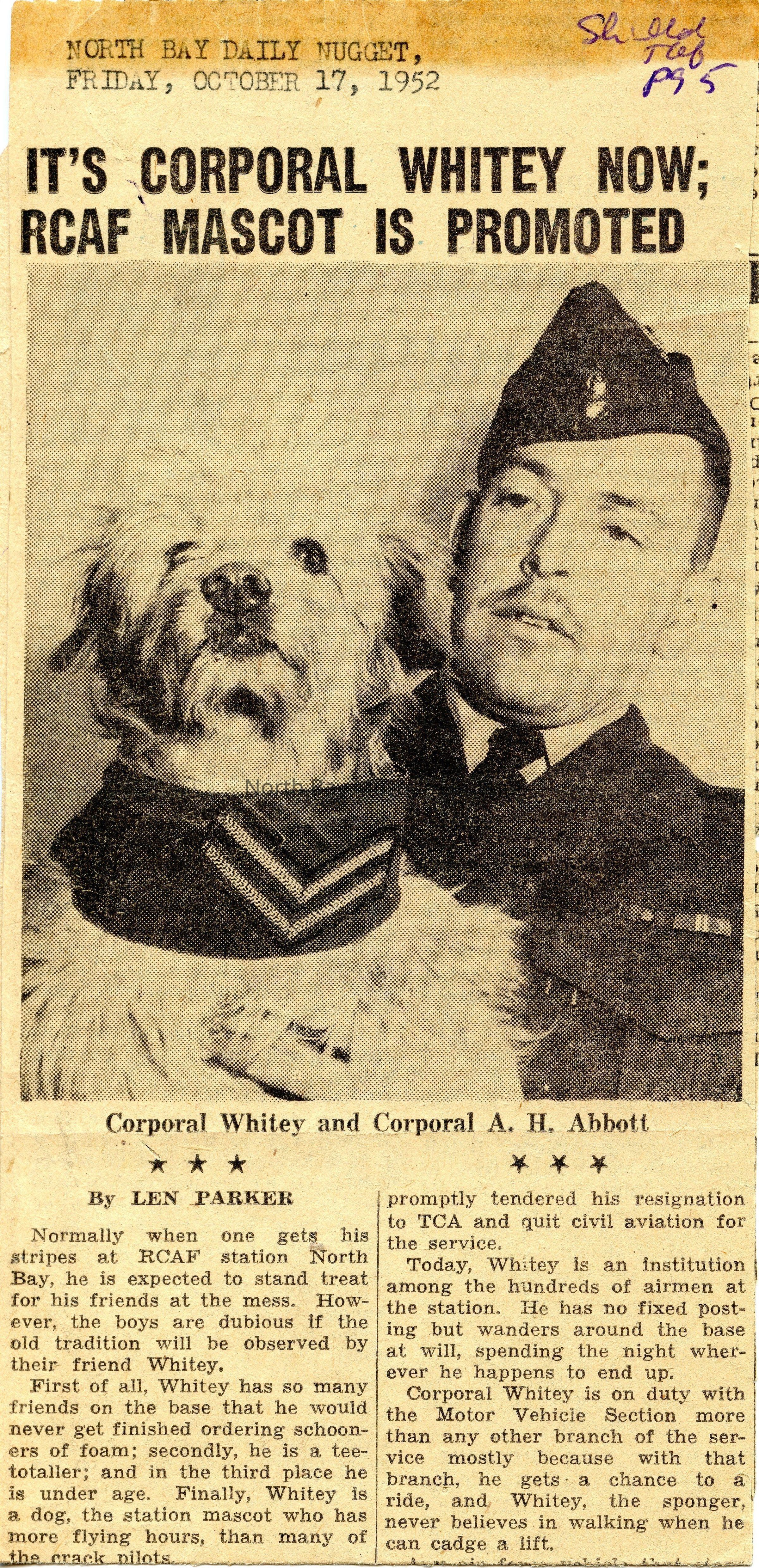 Newspaper article about Corporal Whitey, the RCAF mascot. Whitey first made his appearance at the airport back in 1943 when it was being used as a training base for Royal Air Force personnel. Of dubious parentage but showing suspicious signs of Yorkshire and Spaniel, he was brought into the base by Manager L.W. Hicks." When the war ended, Whitey was soon on the staff of the Trans Canada Airlines. With the postwar expansion of the RCAF and the return of the airmen, Whitey "tendered his resignation" to TCA and was once again an institution among the airmen at the station. In 1952, the North Bay Daily Nugget ran this story about his promotion to Corporal Whitey.