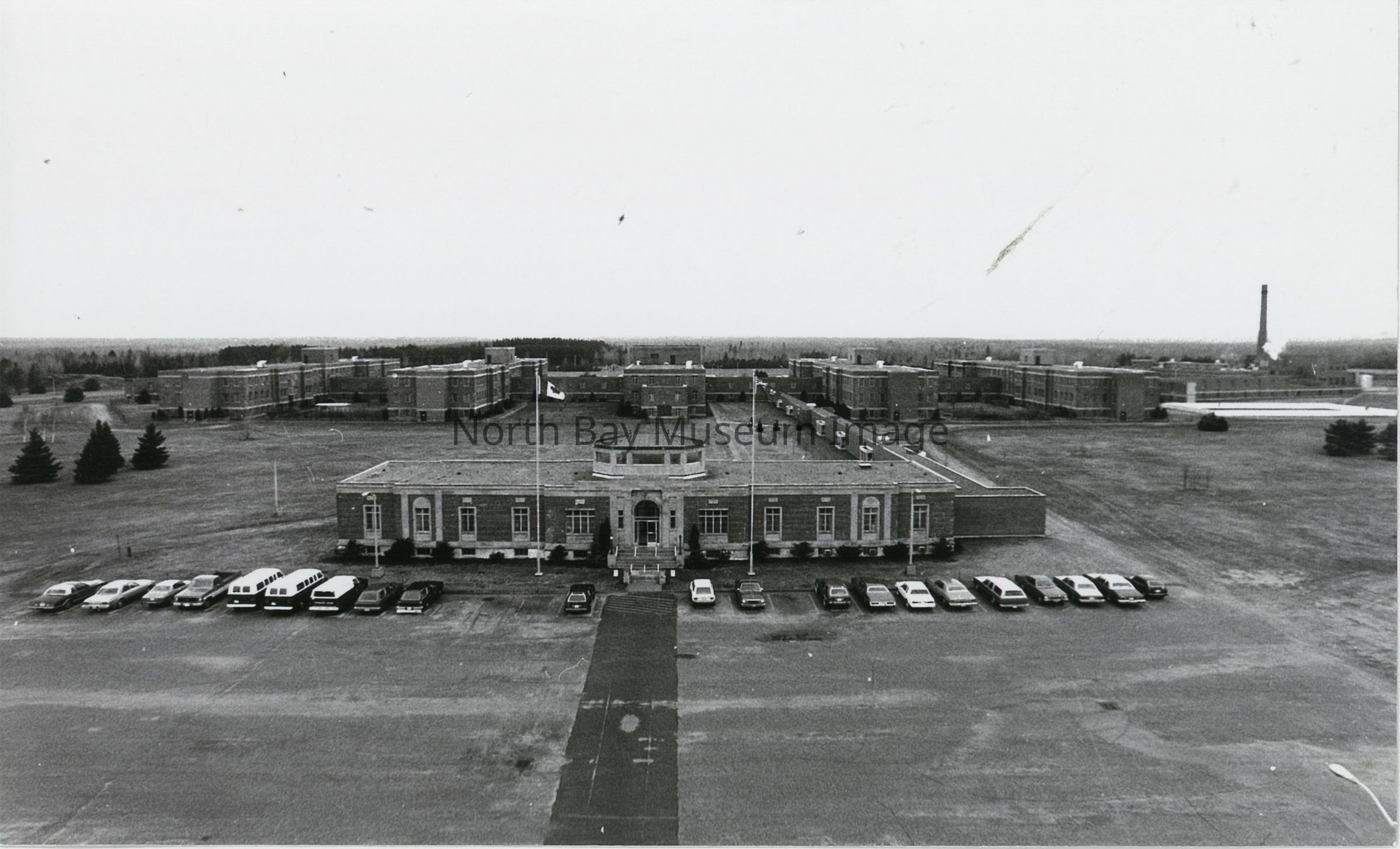 This photo features the North Bay Psychiatric Hospital taken from the road with outbuildings in back.