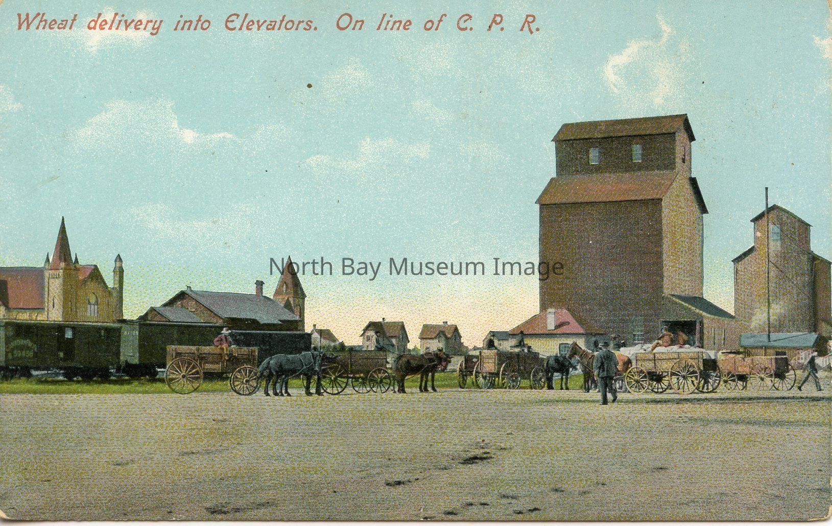 This is a coloured Postcard entitled "Wheat Delivery into elevators, On line of C.P.R." The illustration is of horses and buggies and men standing around on a unpaved, dirt road. In the background there are various buildings. In the right hand side one of the building is possibly the grain elevator.