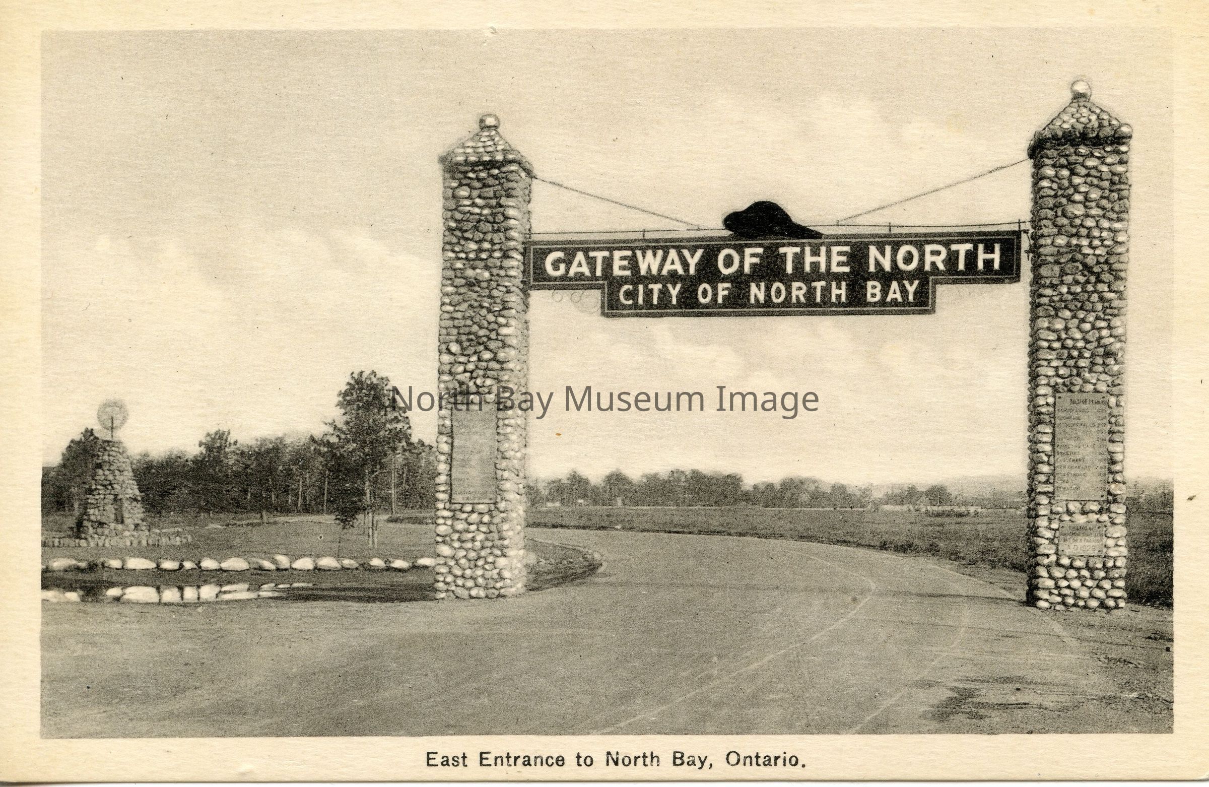 The front of the postcard has a Sepia photo of the archway. The archway spans Monk St. Running into Lakeshore Drive. The sign reads "GATEWAY OF THE NORTH CITY OF NORTH BAY" with a Beaver on top. The sign is hung between two stone pillars. There is a circular bed of flowers to the left, surrounded by stones. There is a Rotary Cairn behind the archway. Lee Park is located to the right of the archway.