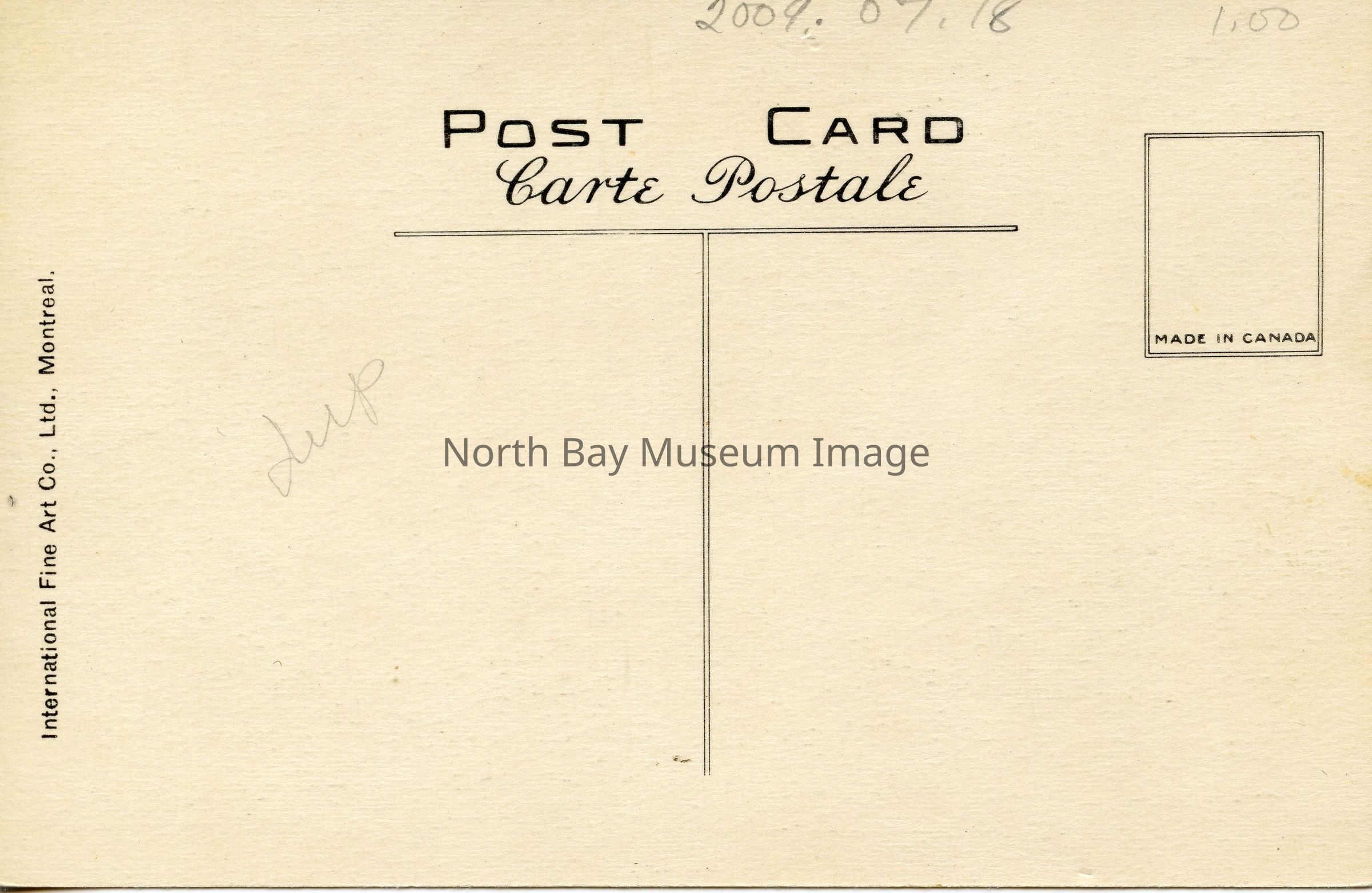 On the back of the postard there is no message or address. There is no stamp on it, but in the location of the stampmark says "Made in Canada." The top right hand corner has 1.00 written in pencil.Creator