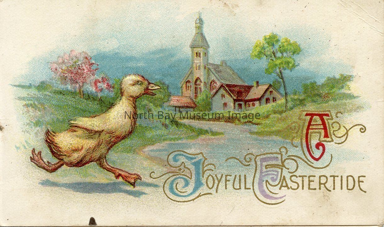 Inside the card on left portion of card is written in French, the words, Recois cette petite carte pour un heureux jour de P' aques,