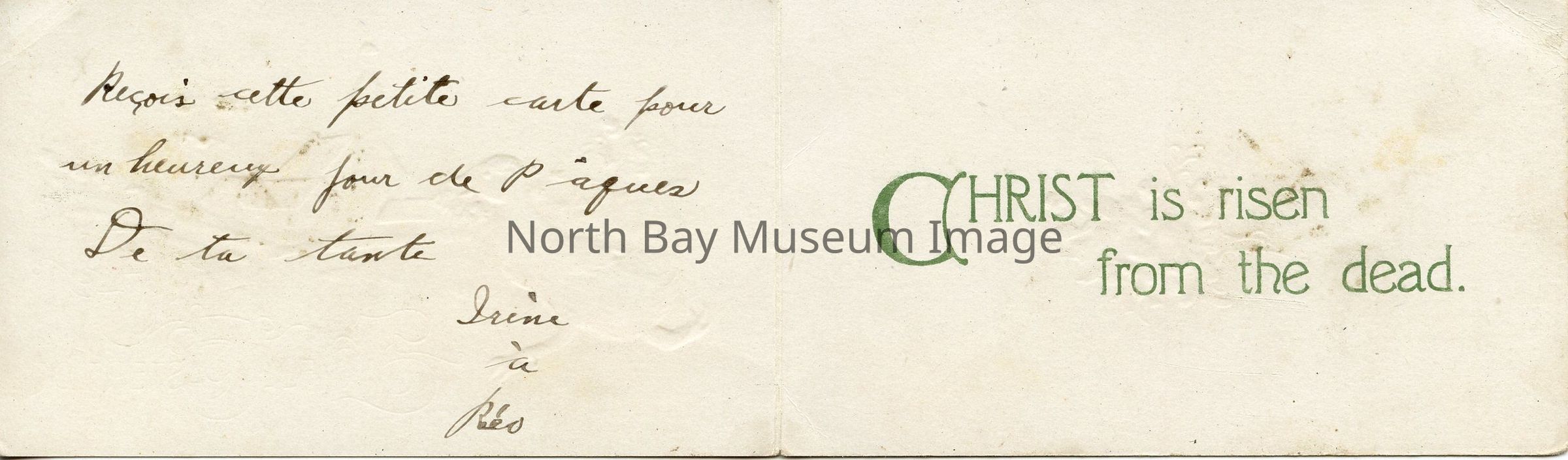 De ta tante, Irine a' Reo. On the right portion of the inside of the card printed in green, the words, "Christ is risen from the dead".