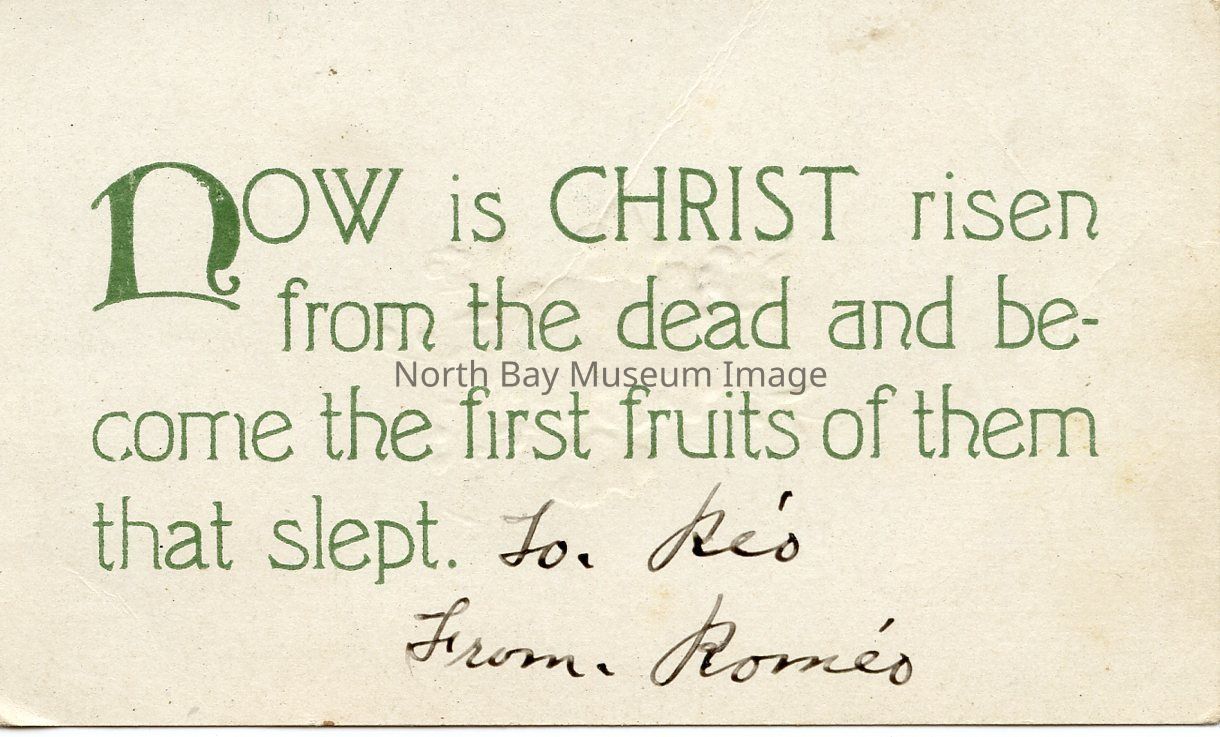 Inside of the card, there is printing in green letters words saying, "Now is Christ risen from the dead and become the first fruits of them