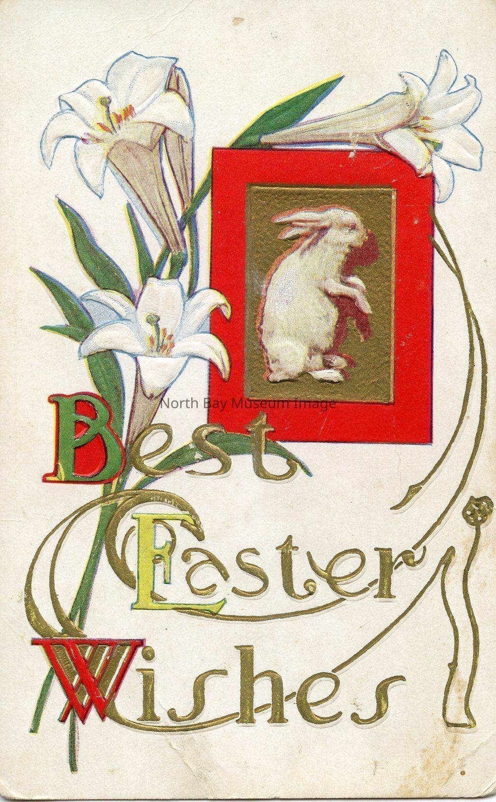 This is a coloured postcard. The front has a white background. There are white lillies around picture of rabbit sitting on back legs, with gold