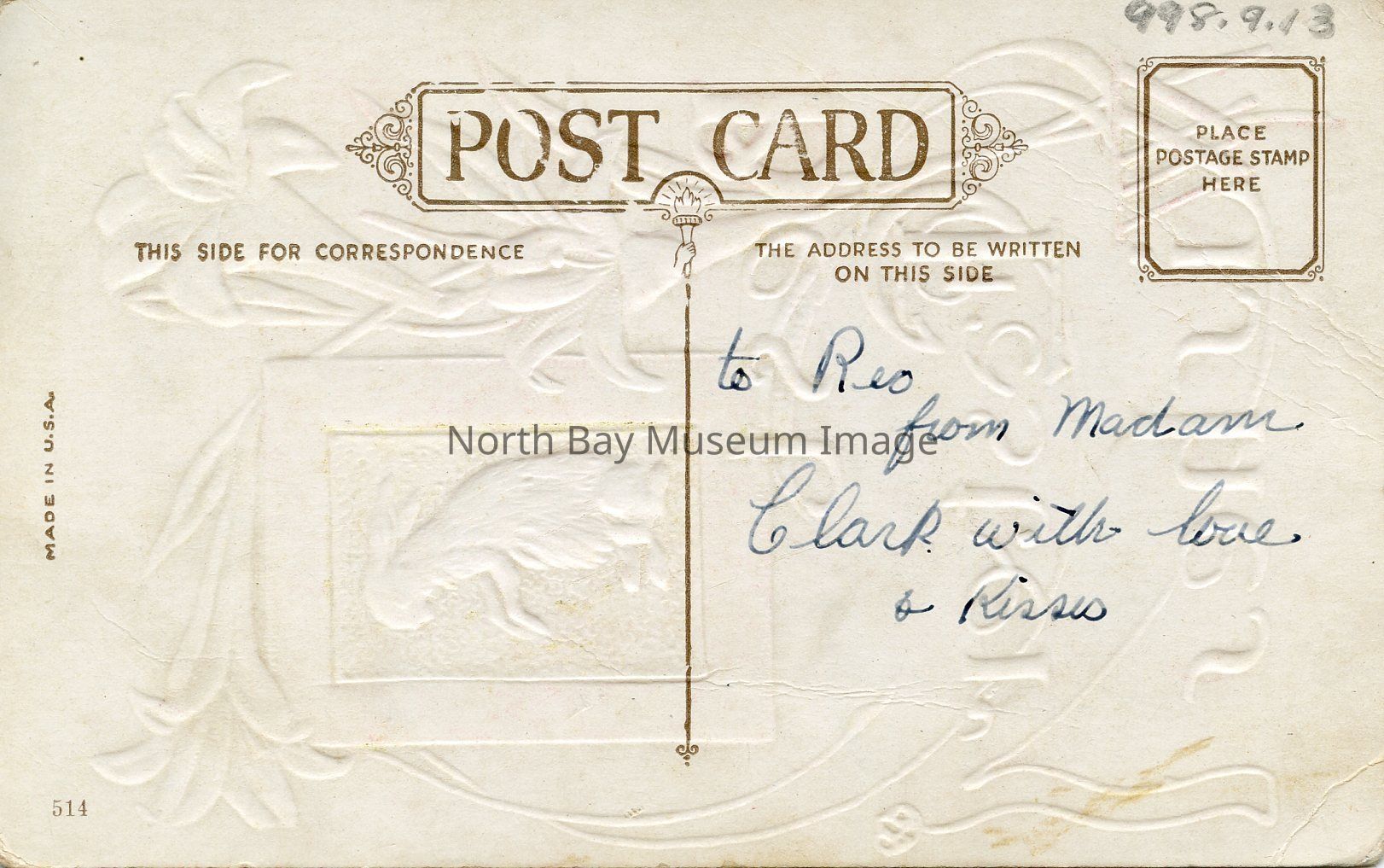 This postcard is unused. There is a handwritten message written in blue ink.
