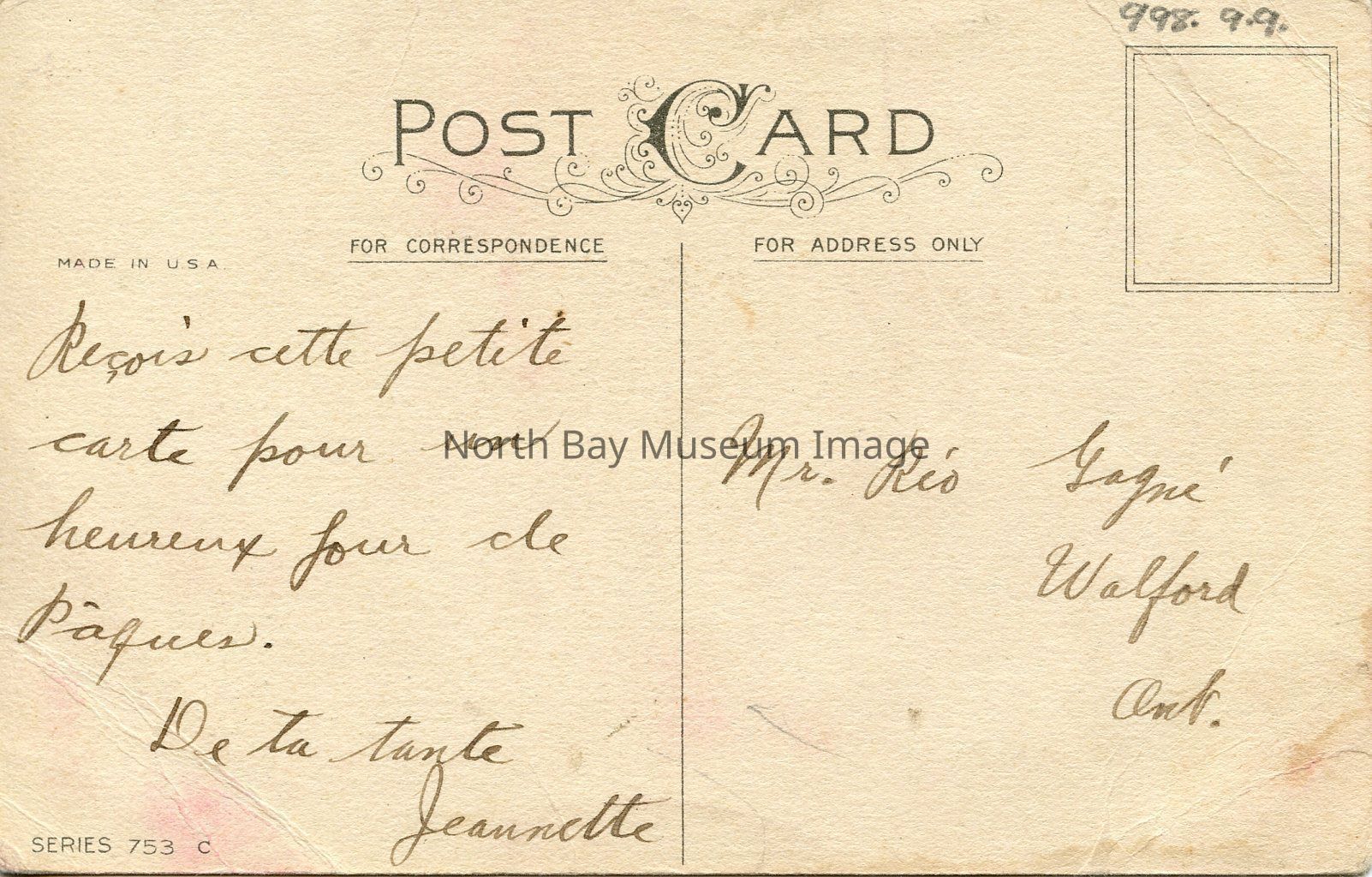 In the back of the postcard there is a small handwritten message and address in black ink. There is no stamp in the right hand corner.