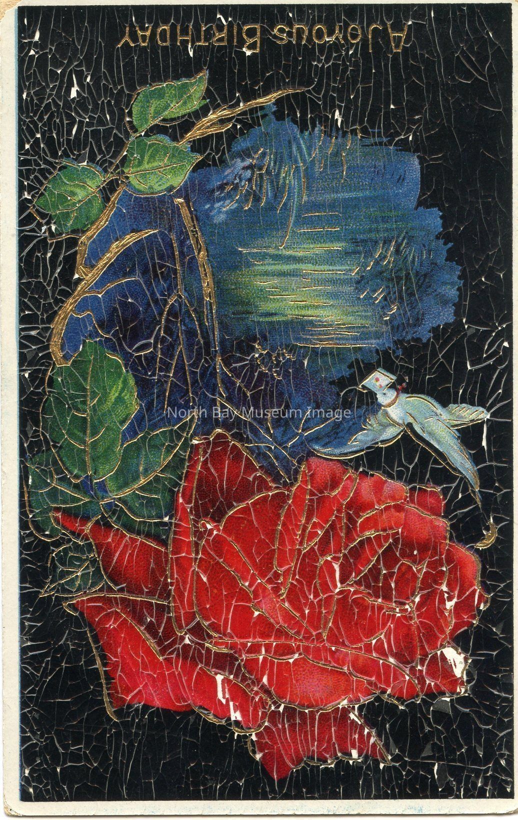 This is a coloured postcard with a rose on it. This postcard is very deteriorated (the whole of surface is crazed). The card reads" A Joyous Birthday"