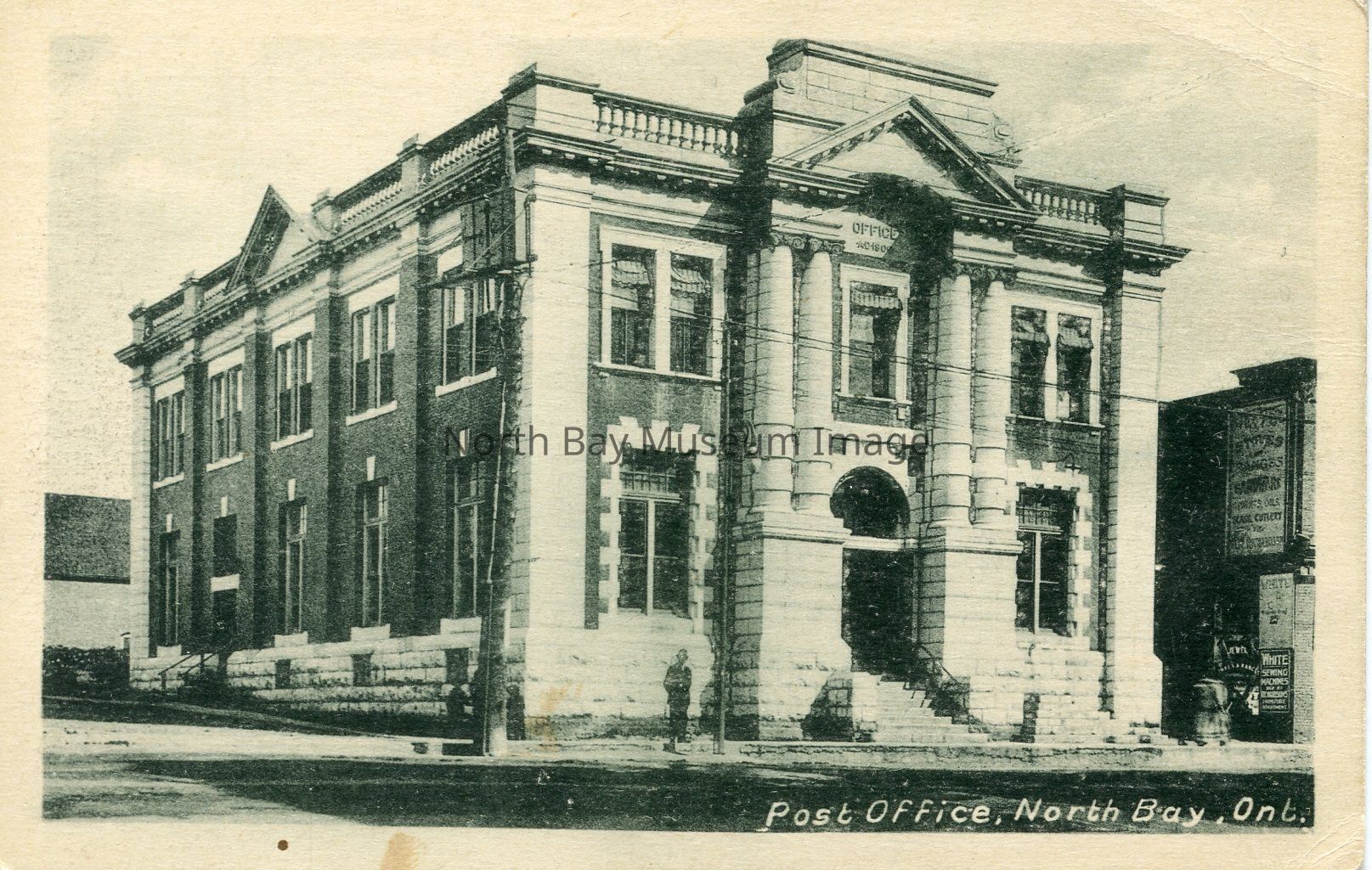 This is a black and white postcard of the Post Office in North Bay, Ont. The photo is taken from the side of the building. There is about six steps with a railing to get to the main entrance of the two storey building. There appears to be another door to enter the post office at the side of the building. There are large windows all around the building. There is also a railing surrounding the roof. There appears to be a man standing near the front entrance of the post office.