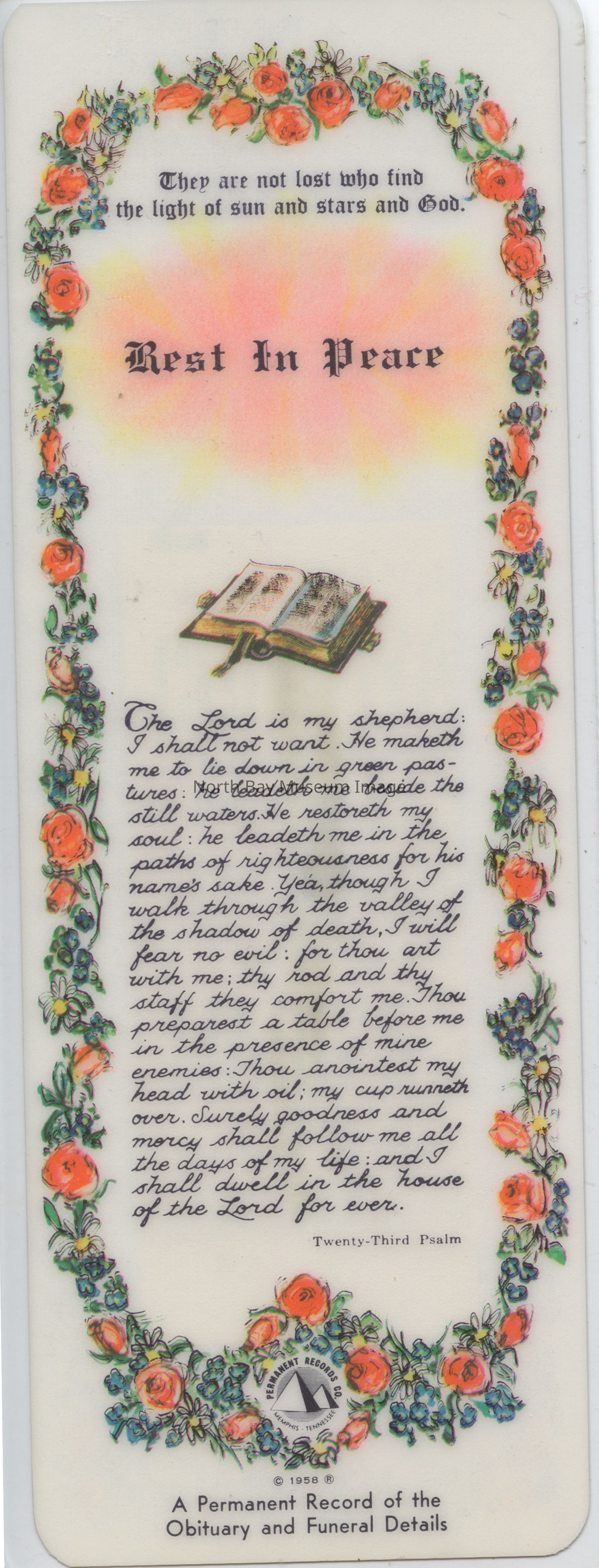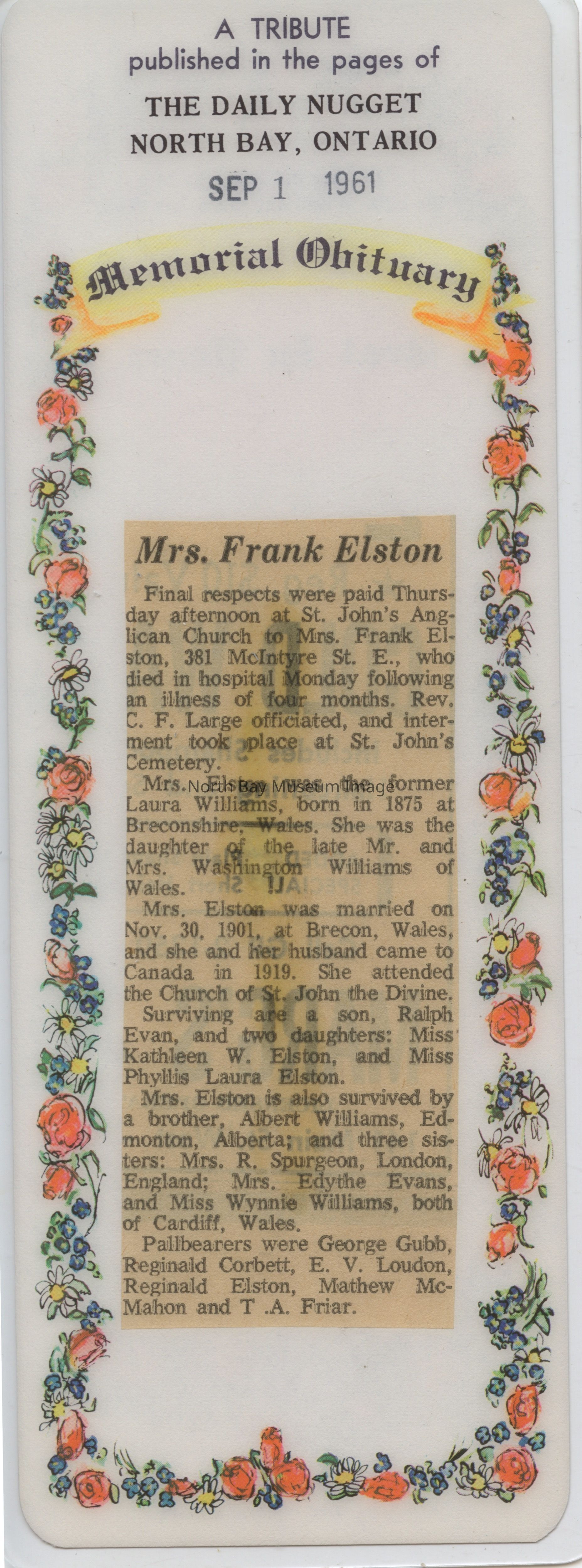 Bookmark with Nugget obituary for Laura Elston (wife of Frank Elston).