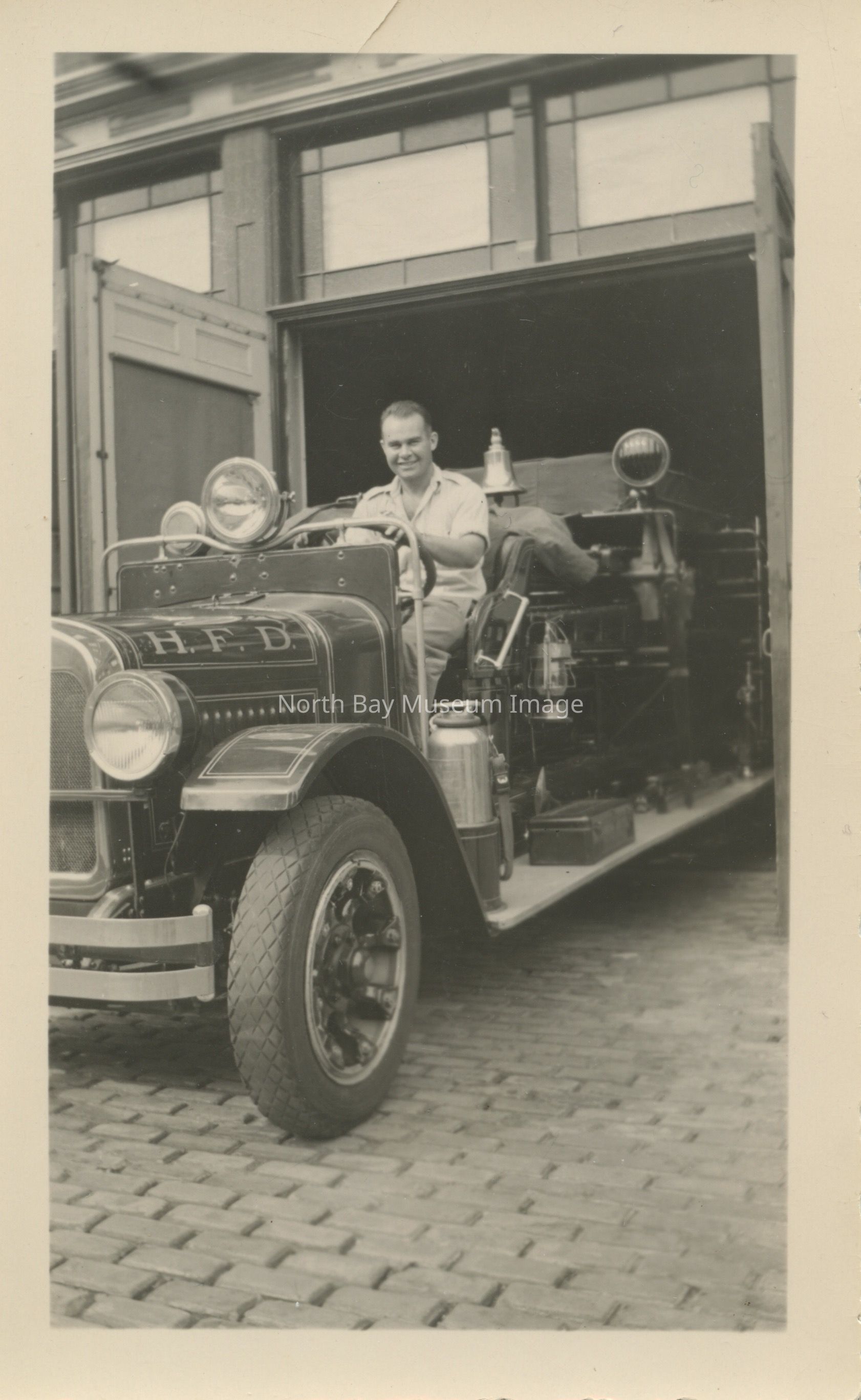 Photo of Ralph Elston( son of Frank Elston) on a firetruck in Haileybury.