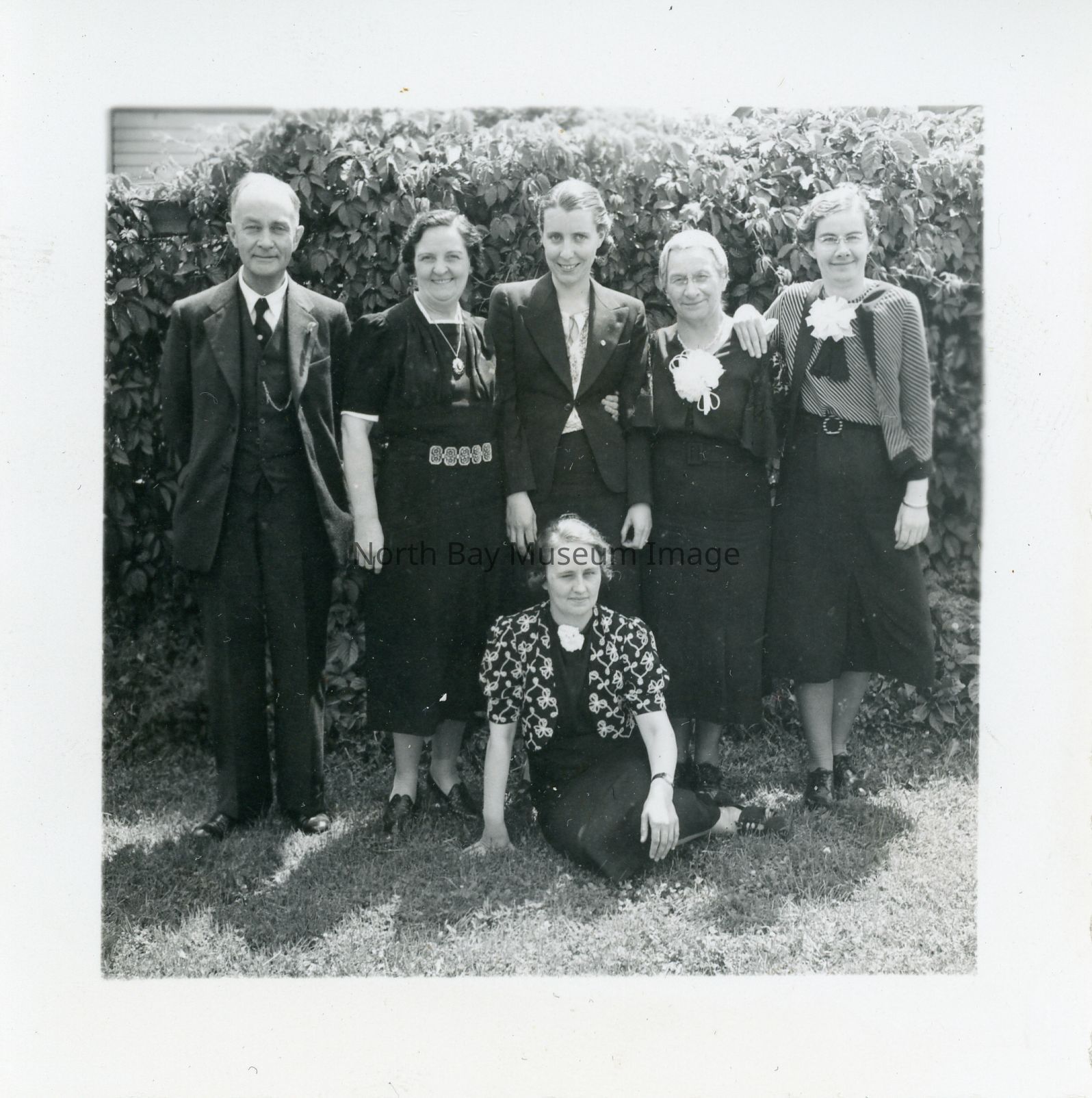 Photograph of Ralph Elston and his wife with their daughter Winnifred and Laura (Frank's wife) with Phylis in back row. Ralph's other daughter in front row. Standing outside in front of trees.