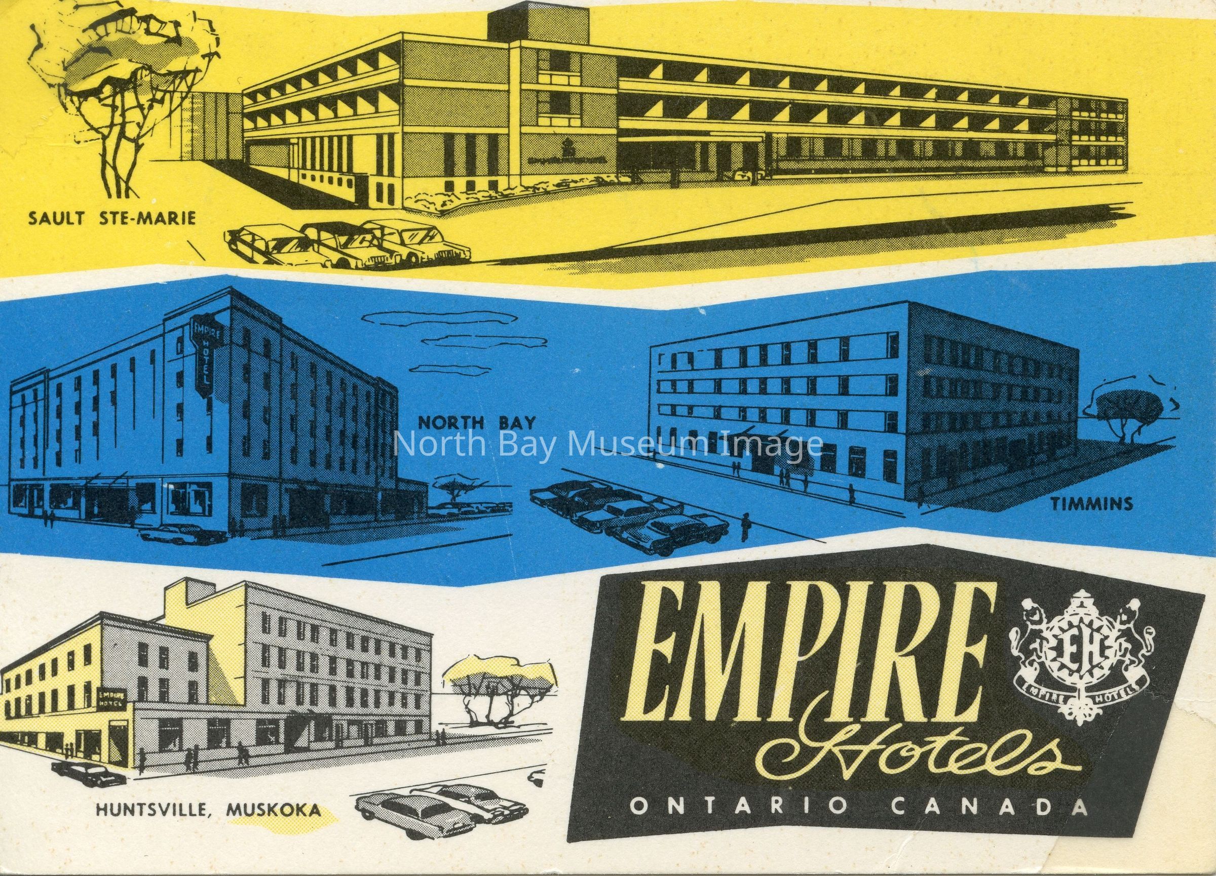 Postcard with Black-and-white illustrations of Empire Hotels in Sault Ste-Marie (with yellow background), North Bay and Timmins (with blue background) and Huntsville, Muskoka. North Bay's Empire Hotel was completed in 1928.