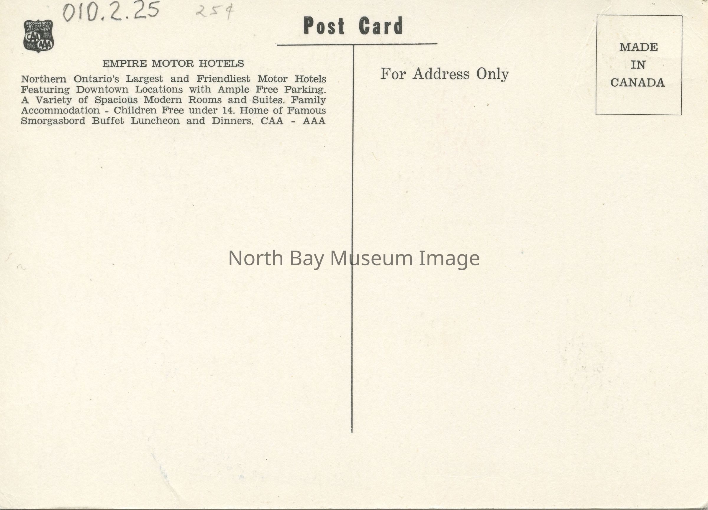 Northern Ontario's Largest and Friendliest Motor Hotels Featuring Downtown Locations with Ample Free Parking. A Variety of Spacious Modern Rooms and Suites. Family Accommodation - Children Free under 14. Home of Famous Smorgasbord Buffet Luncheon and Dinners. CAA-AAA".