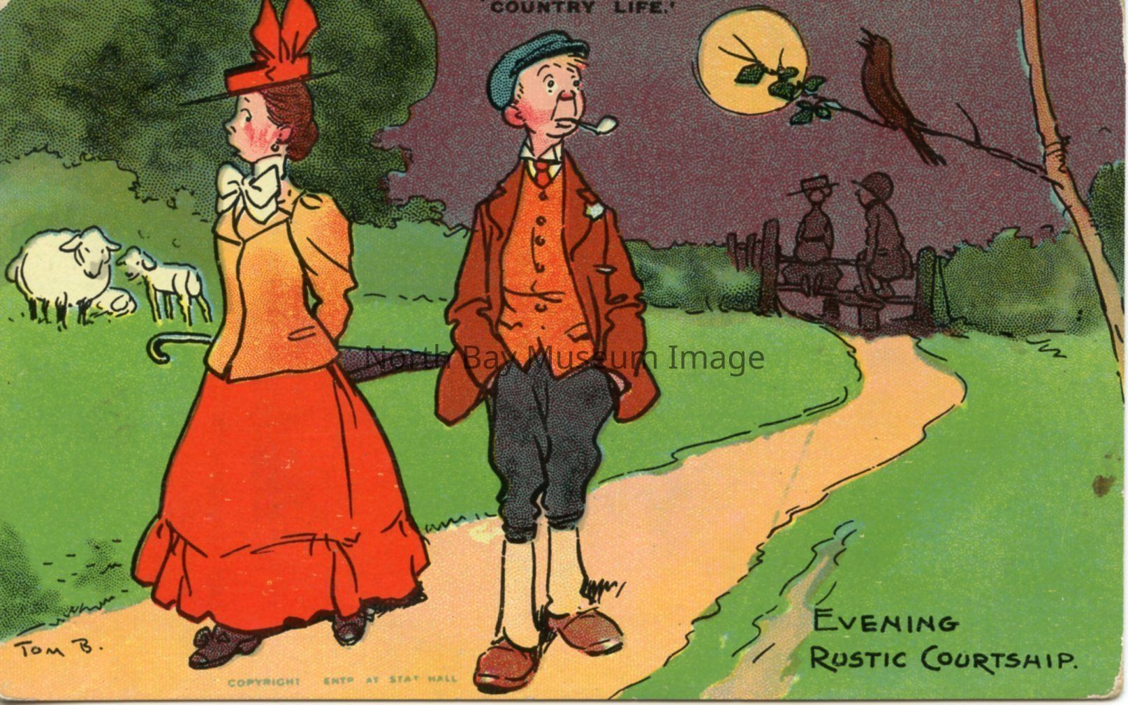 This is a colourful postcard entitled "Evening Rustic Courtship." This image is of a couple walking along a path outside in the evening. The full moon can be seen in the background with clouds in the sky. The man and woman appear to be nervous on their walk. Both are looking away from each other