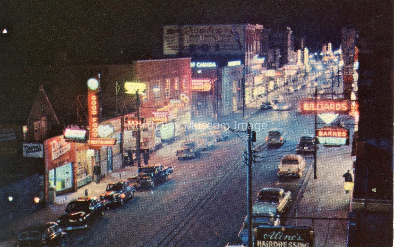 Coloured postcard of Main St. East, taken looking West. The photo was taken at night with neon signs visible including "Pappas Cleaners", "Good Food Restaurant", on the right hand side. "Taxi", and "Loans", signs are also present on the left. There are also signs of "Aline's Hairdressing",and "Barnes Wines", on the right.