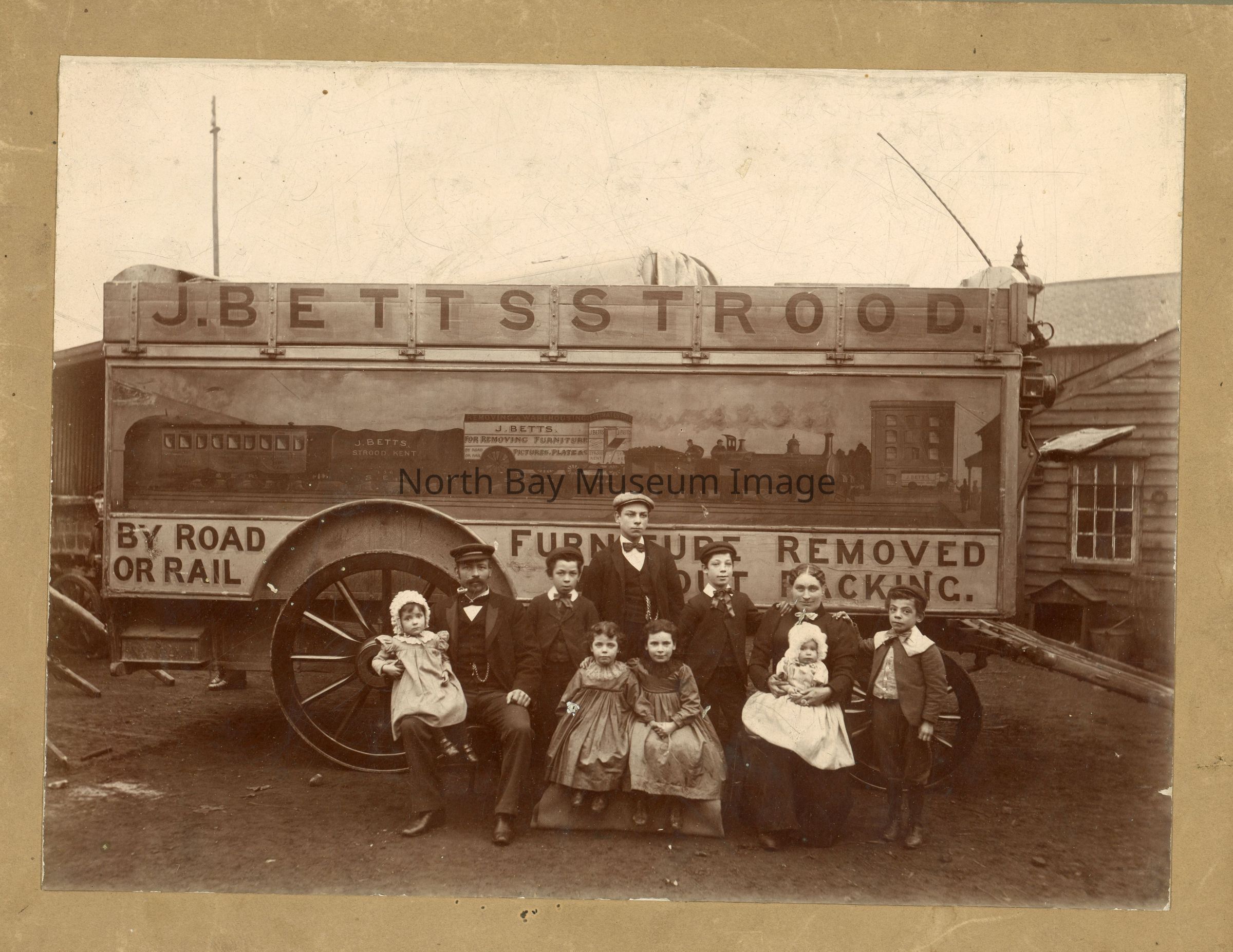 Sepia; a family sitting in front of a moving wagon, with a sign saying "J.Bettsstrood…"