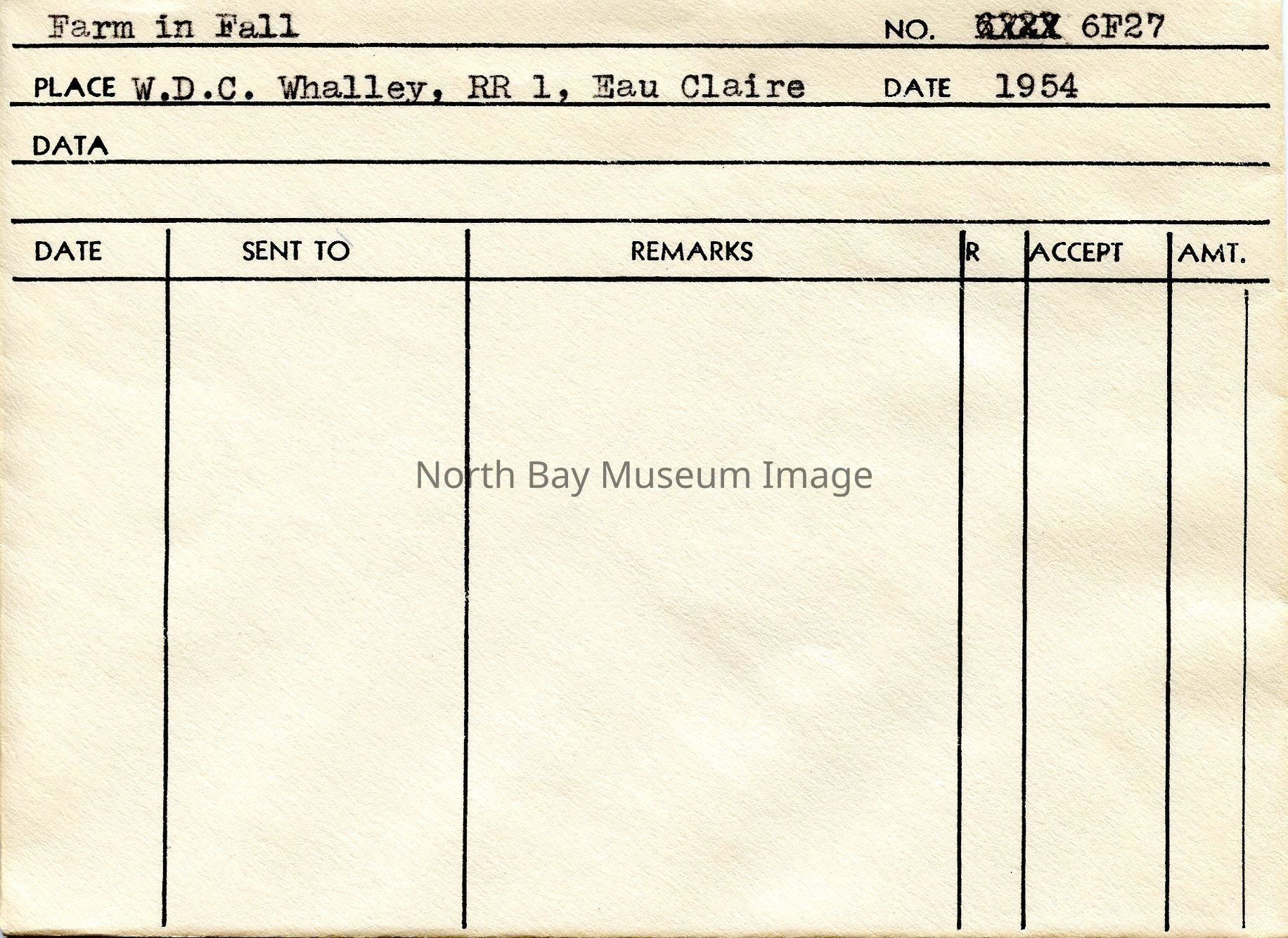 Envelope (a) contains the photograph and negative (b-c) of a farm in the fall. The image shows a litttle wooden farm house in the distance as well as a little wood barn. A part of the Forder Collection. The photographers original accession number is 6F27. All the publications of the images are written on the envelopeCreator