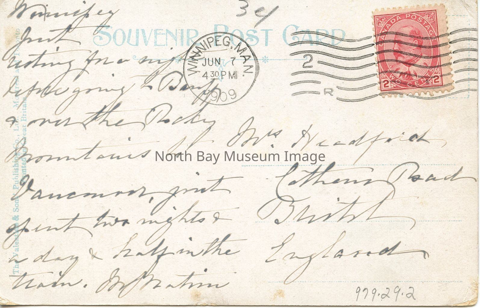 On the back of the postcard there is a long message and address in black ink. There is one red 2 cent stamp that has been crossed out by the post office with black squiggly lines. The postmark stamp says "Winnipeg, Man. June 7th 4:30 pm 1909."