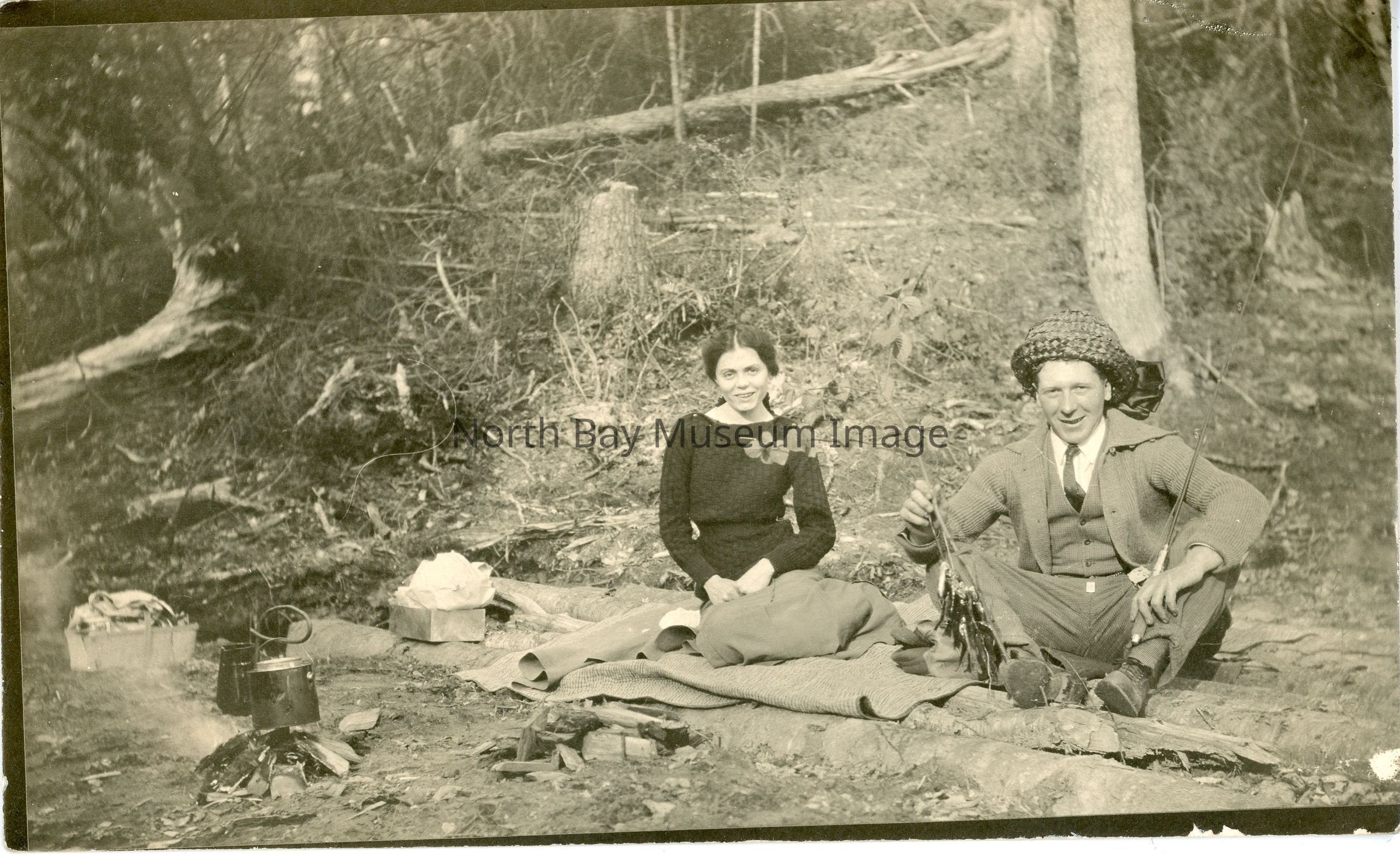 Sepia photograph of Alex Soute and Flora on a picnic.