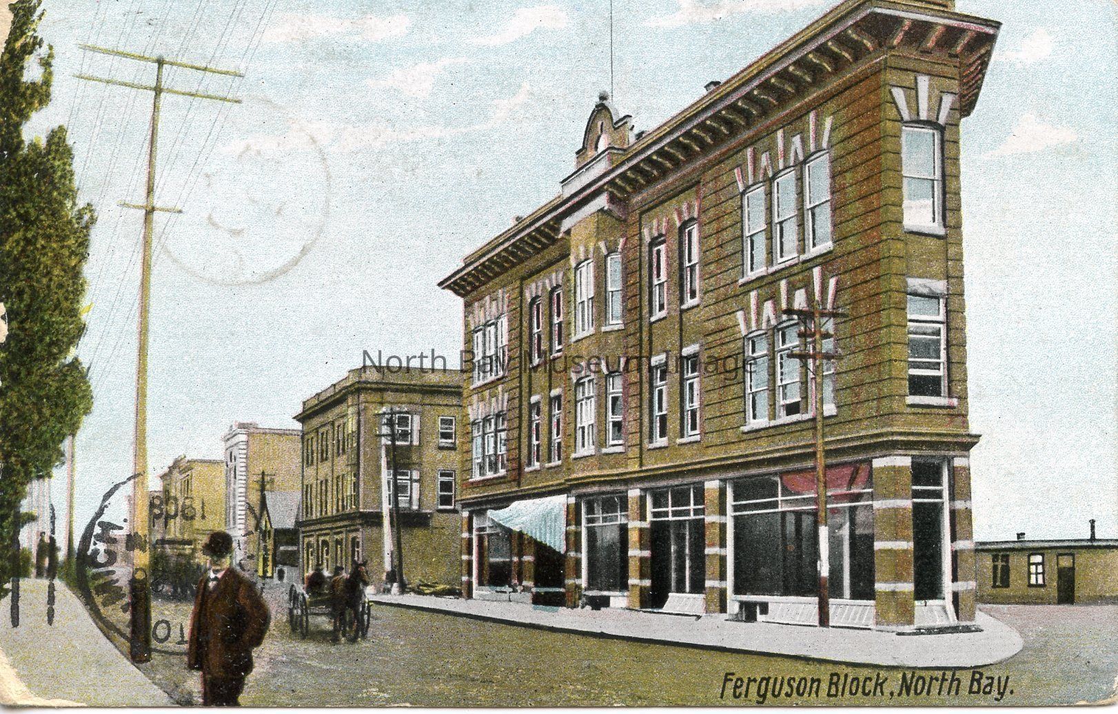 This is a coloured postcard of Ferguson Block in North Bay. The image appears to be painted or drawn. There are four prominent buildings in the picture on the left hand side. On the right hand side there is a sidewalk and a fence. Possibly on the other side of the fence is a open space for recreational activities. A horse and buggie is seen driving down the street.