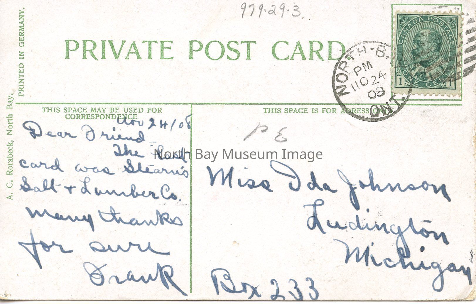 On the back of the postcard has the words "private post card," in green text. There is a green one cent stamp on the postcard that has been cancelled out with squiggly lines. There is a message and address in blue ink.